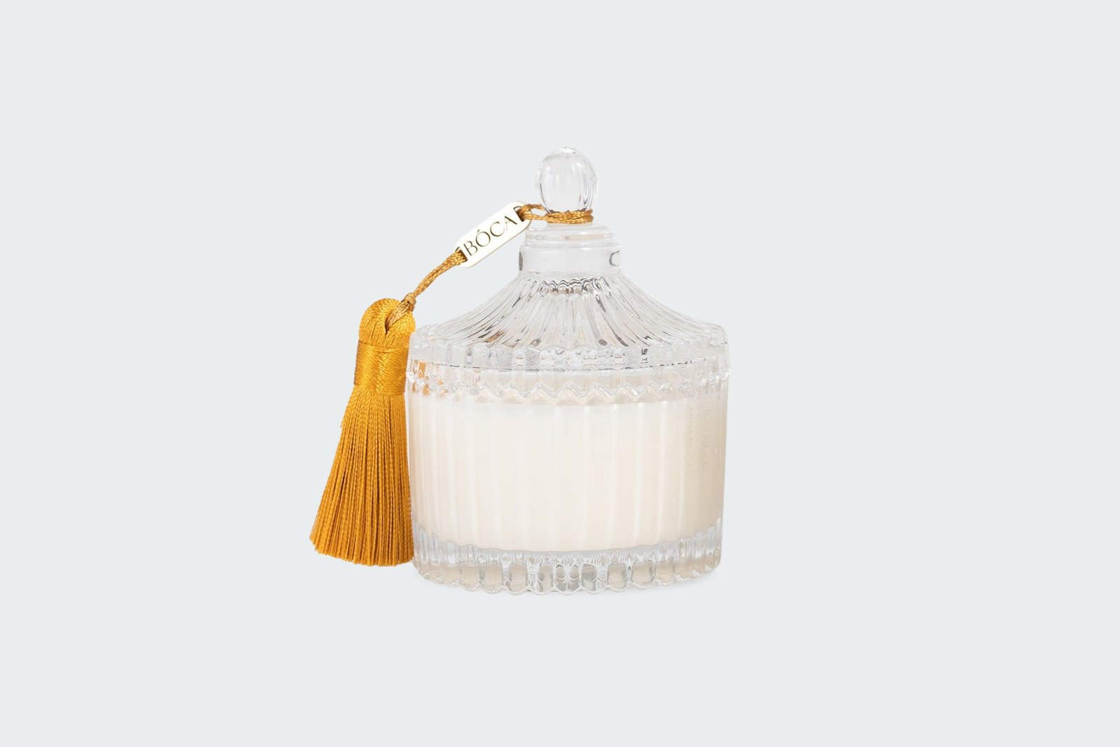 Ароматическая свеча в стеклянной шкатулке с шелковой кисточкой. Особая форма шкатулки при горении дает красивое преломление света, игру с тенями, что создает в пространстве невероятную атмосферу.