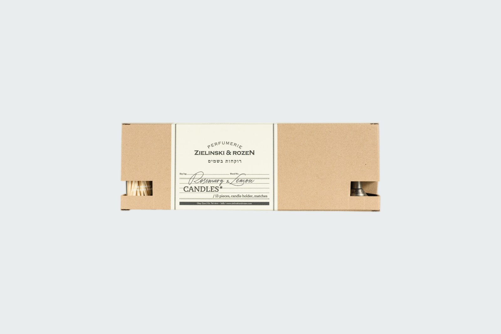 В комплект также входят подсвечник в винтажном стиле с гравировкой-слоганом бренда "С каждым вдохом чувствовать себя собой" на иврите и каминные спички для зажигания свечи.