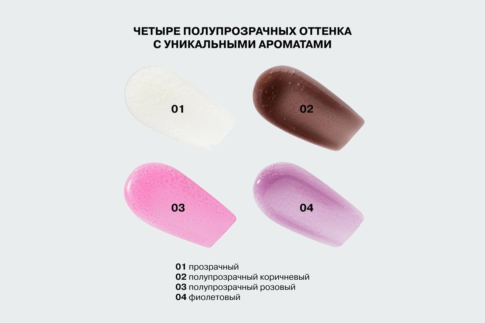 Плампер-блеск доступен в четырех полупрозрачных оттенках с ароматом черники, яблока, клубники и винограда.