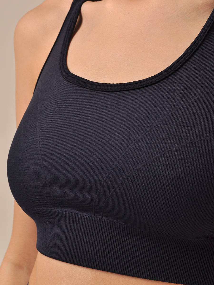 Женский спортивный топ на широких бретелях. Модель выполнена из мягкой эластичной микрофибры, с фактурными вставками, без чашки. Анатомическая вязка повторяет форму груди, плотная резинка по низу и широкие бретели обеспечивают комфортную поддержку.