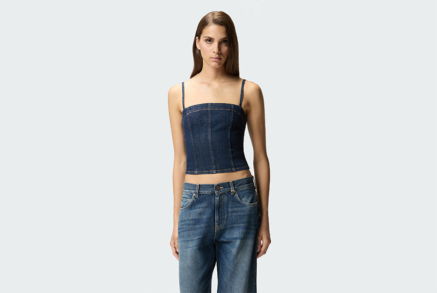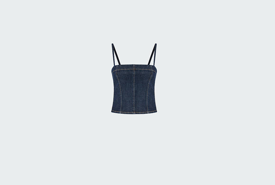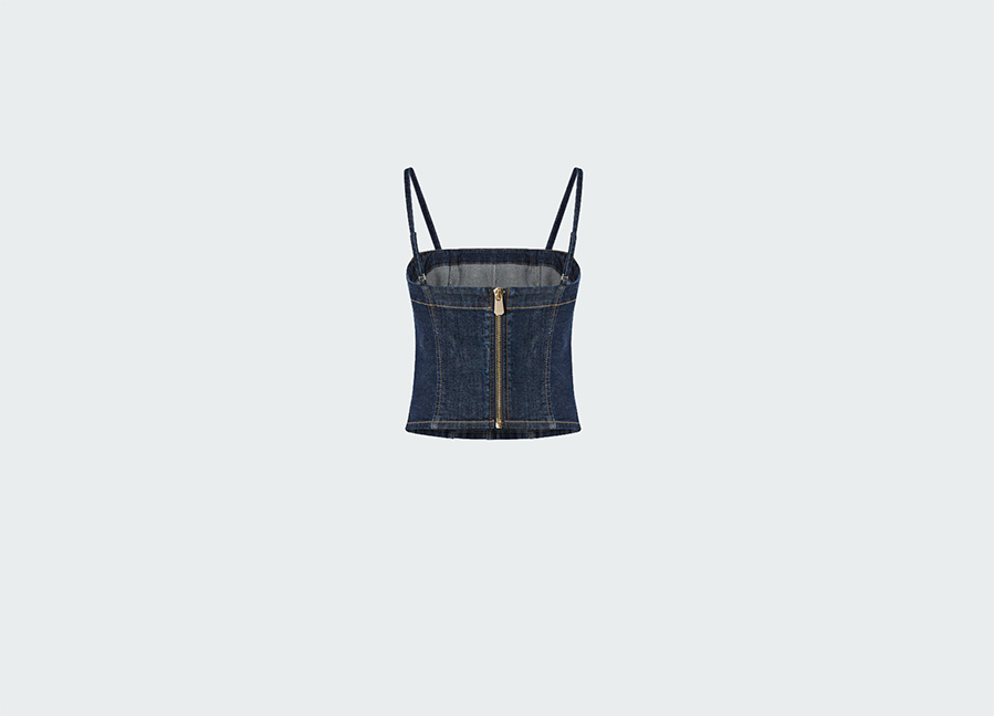 Бюстье с тонкими регулируемыми бретелями, прямым вырезом и контрастной декоративной строчкой, напоминающей корсетные косточки. Застёжка-молния на спине.