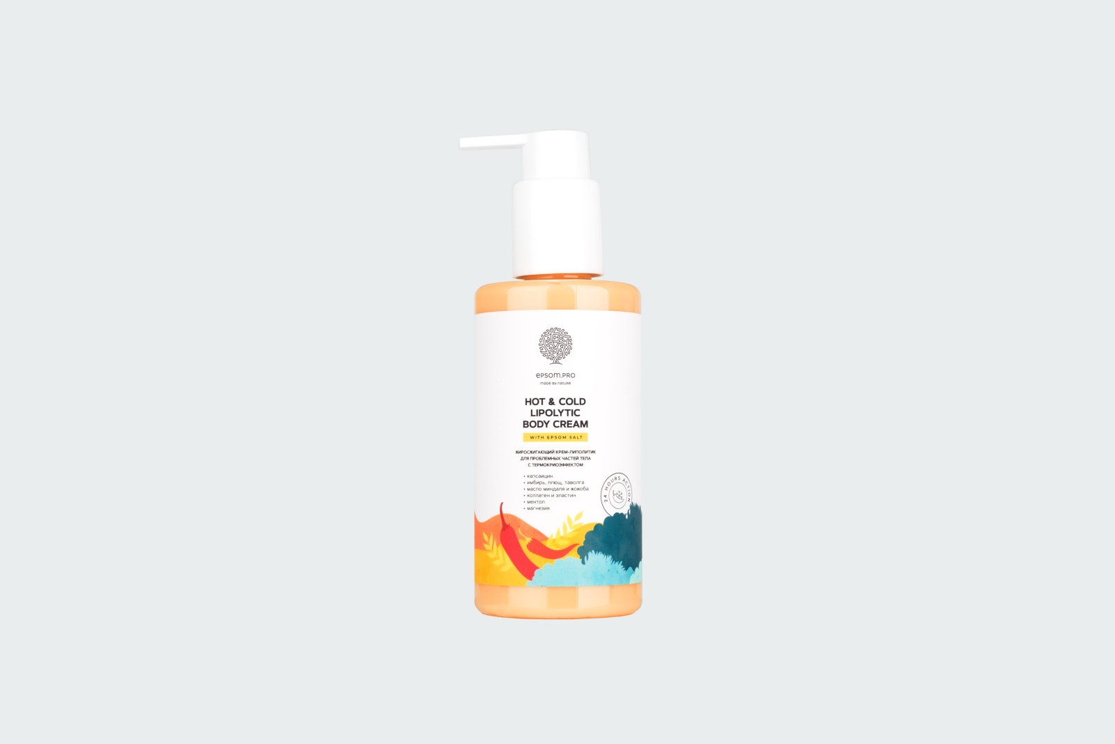 Натуральный крем-липолитик на основе капсаицина, масел и растительных экстрактов быстро впитывается и не требует использования плёнки для обертывания, а его ментолово-цитрусовый аромат надолго сохраняется на коже. Пролонгированное чередование холода и жара оказывает антицеллюлитный эффект, активизирует липолиз, уменьшает отечность и повышает упругость кожи. Крем-липолитик работает в течение 24 часов, не вызывая неприятных ощущений и покраснения.