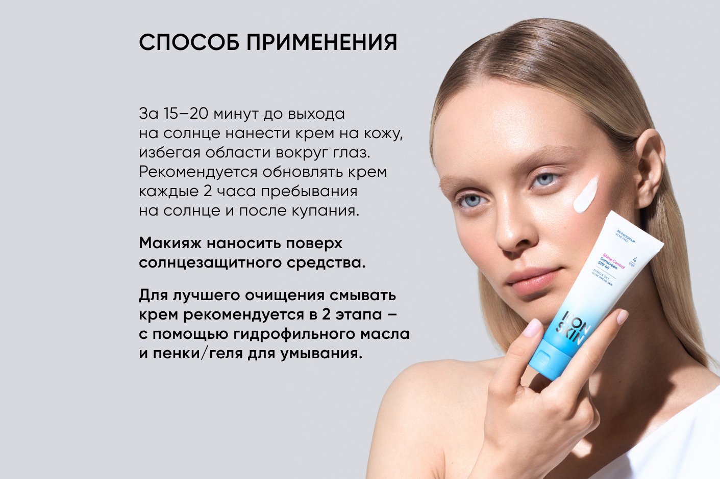 За 15–20 минут до выхода на солнце нанести крем на кожу, избегая области вокруг глаз.