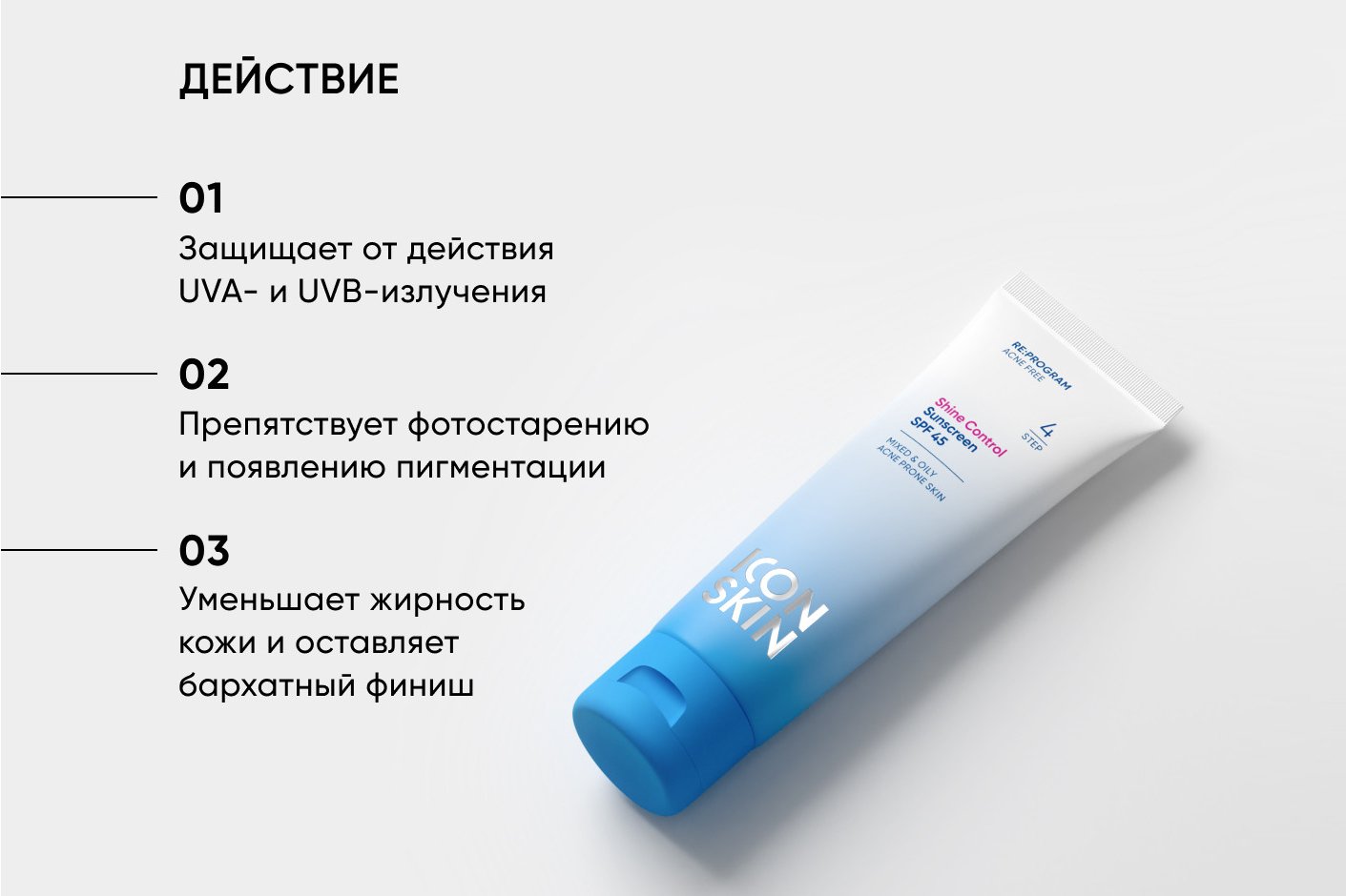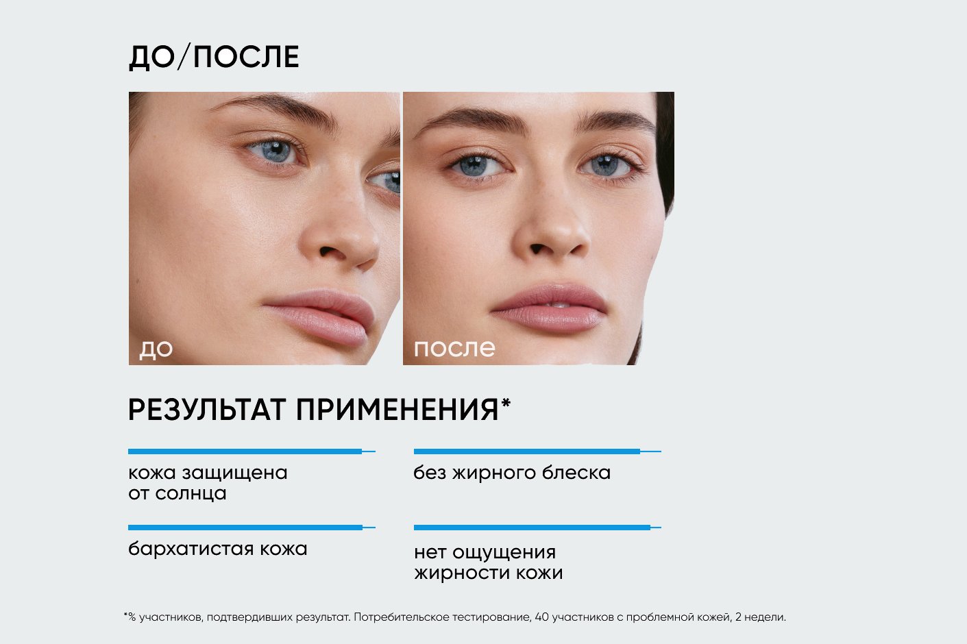 Современные фотостабильные фильтры обеспечивают защиту широкого спектра от UVA- и UVB-излучений с доказанным фактором защиты 45. Формула также содержит ингредиенты с выраженной себорегулирующей, противовоспалительной и антиоксидантной активностью.