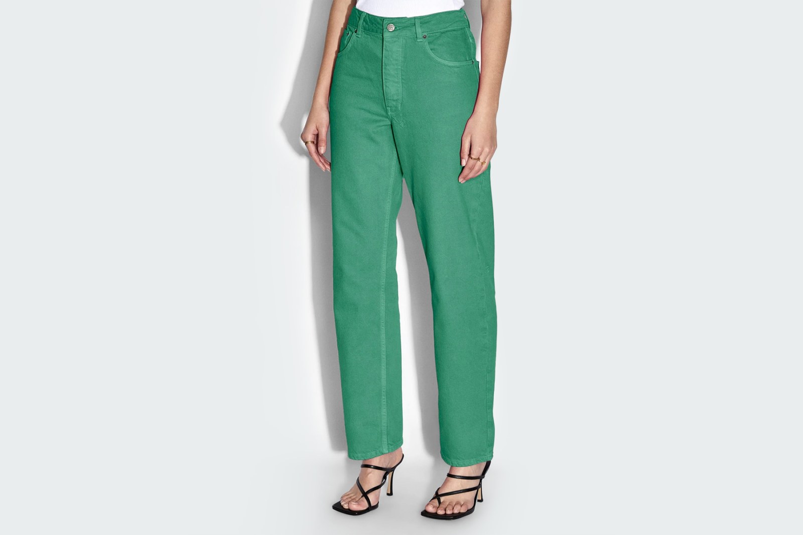 Свободные джинсы прямого кроя с контрастной белой строчкой и логотипом Ksubi. Модель изготовлена из плотного денима премиум-класса зелёного цвета. Средняя посадка, пять карманов.