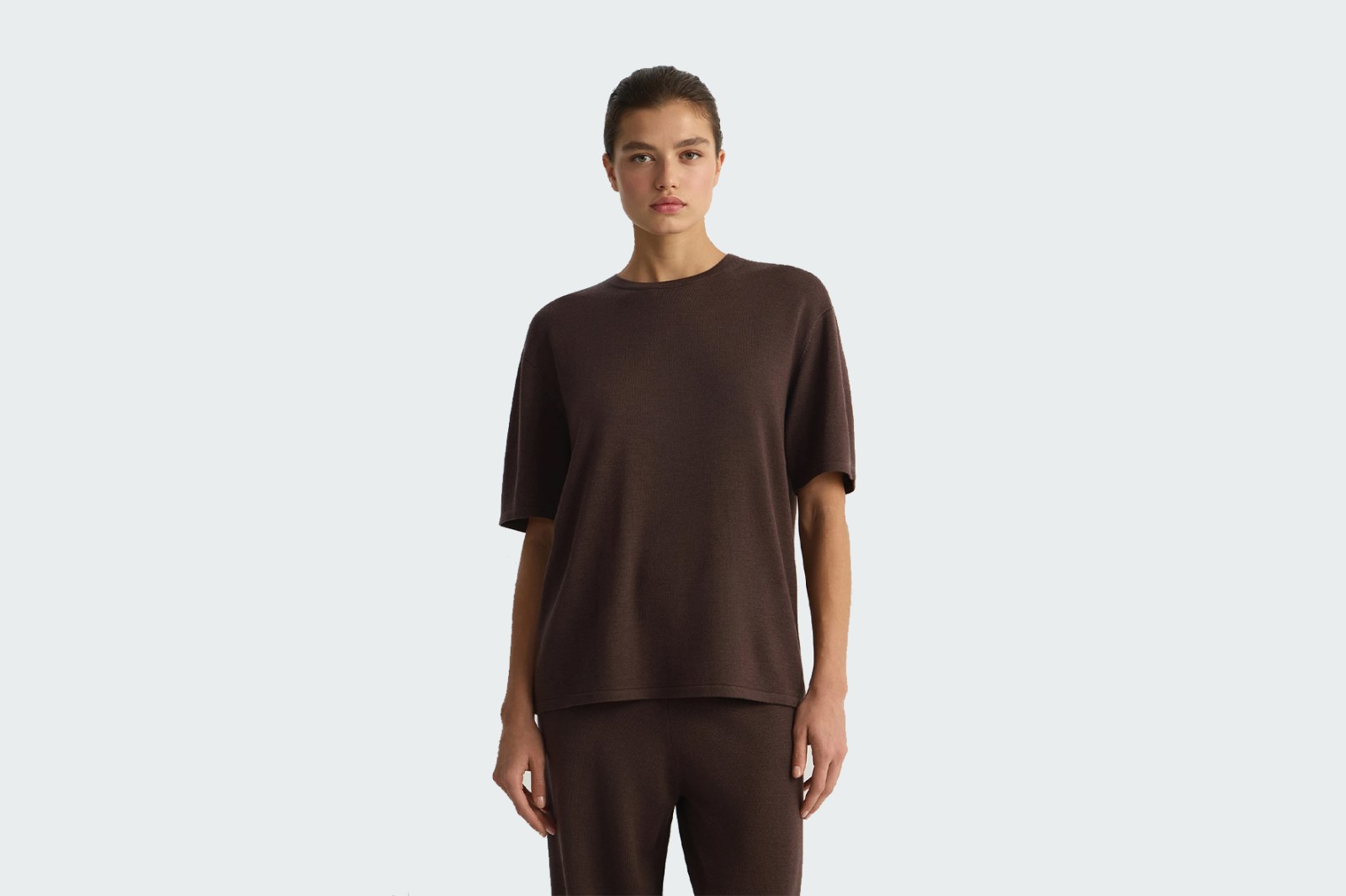 Футболка свободного силуэта с чуть заниженной линией плеч. Выполнена гладким переплетением из мягкой износоустойчивой пряжи с небольшим блеском. Шерсть мериноса делает этот материал тонким, а ацетат — плотным. Благодаря такому составу изделие хорошо держит форму и практически не мнется.
