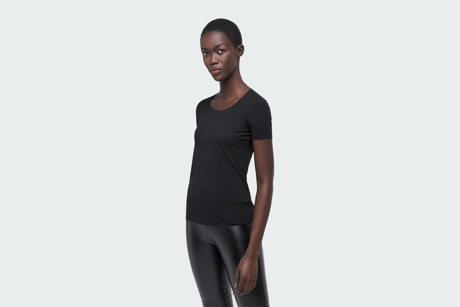 -Футболка облегающего кроя с короткими рукавами и круглым вырезом горловины подойдет для сольной носки летом и в качестве топа под пиджак делового костюма.