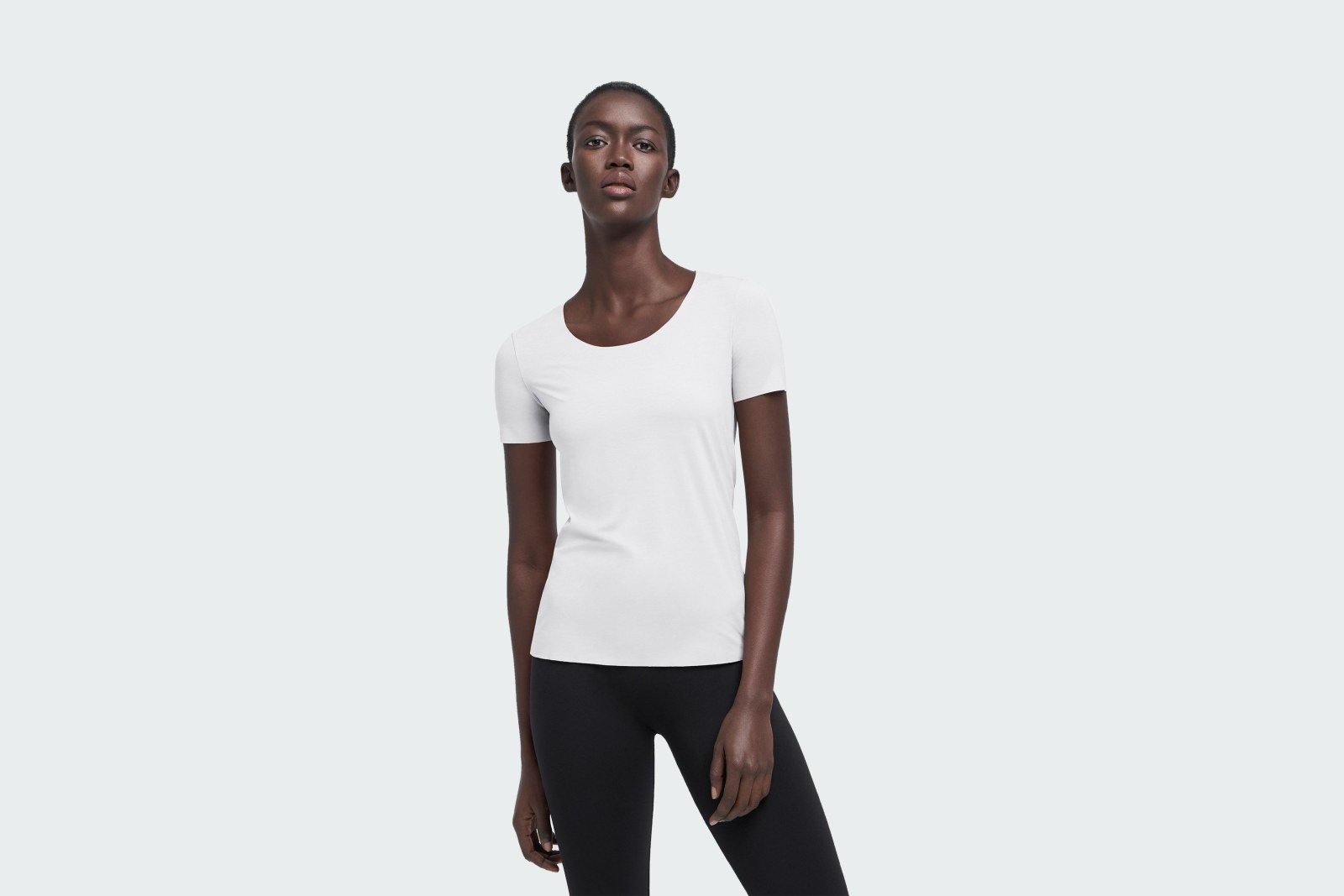 Минималистичная футболка, изготовленная из биоразлагаемых материалов и сертифицированная по золотому уровню стандарта Cradle to Cradle Certified®, отличается мягким материалом, открытой кромкой на вырезке и рукавах, создавая комфортные ощущения при ношении и символизируя экологически осознанный подход к моде.