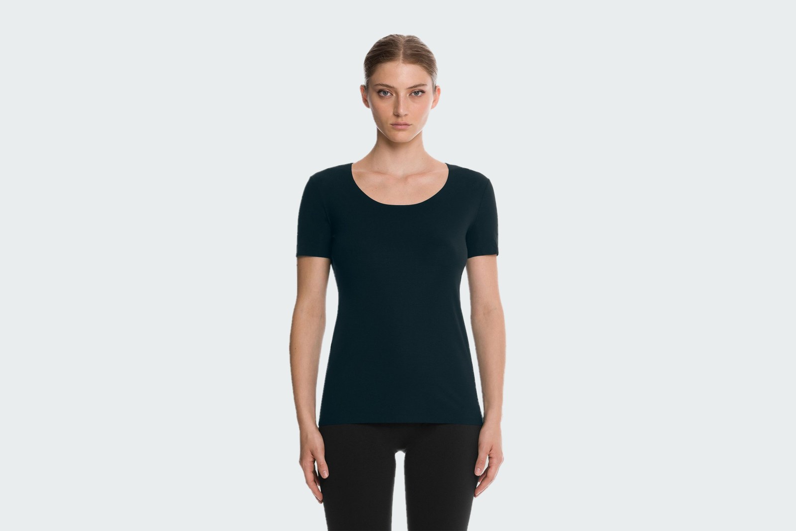 Минималистичная футболка, изготовленная из биоразлагаемых материалов и сертифицированная по золотому уровню стандарта Cradle to Cradle Certified®, отличается мягким материалом, открытой кромкой на вырезке и рукавах, создавая комфортные ощущения при ношении и символизируя экологически осознанный подход к моде.