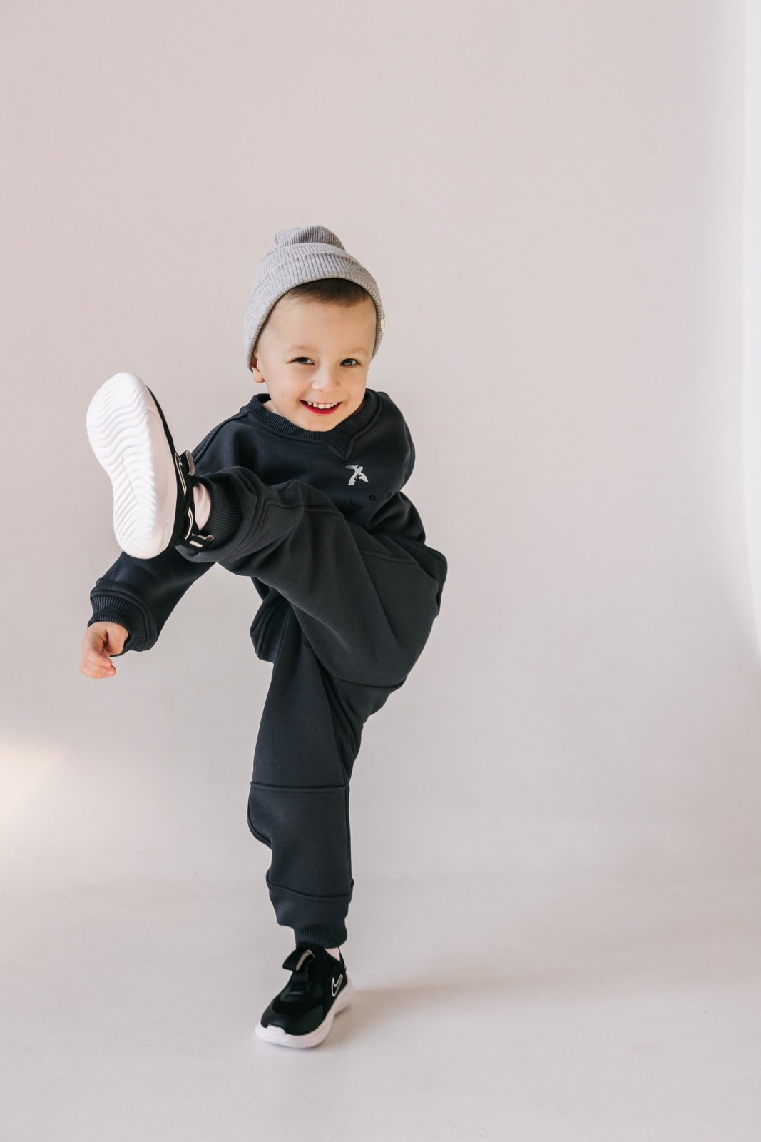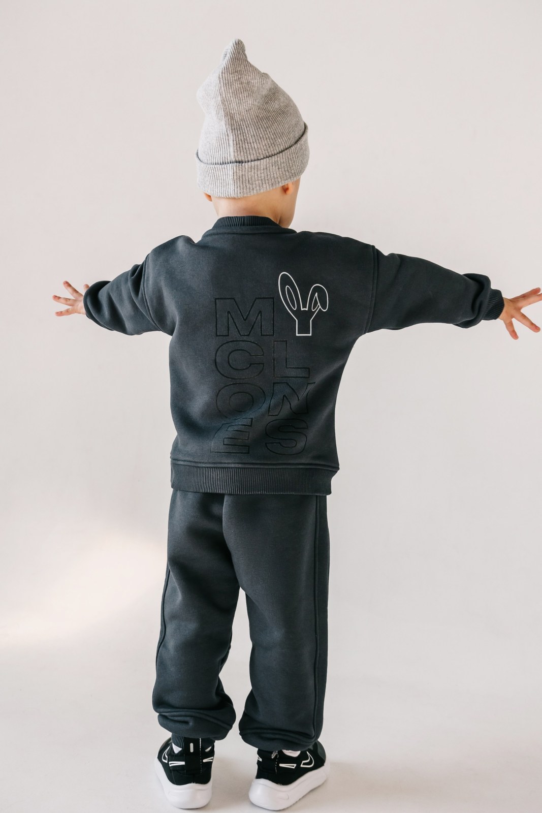 Детский костюм выполнен из премиального футера с микроначёсом: это «дышащий» трикотажный материал, в основе которого — натуральный хлопок, одновременно плотный и практичный.
