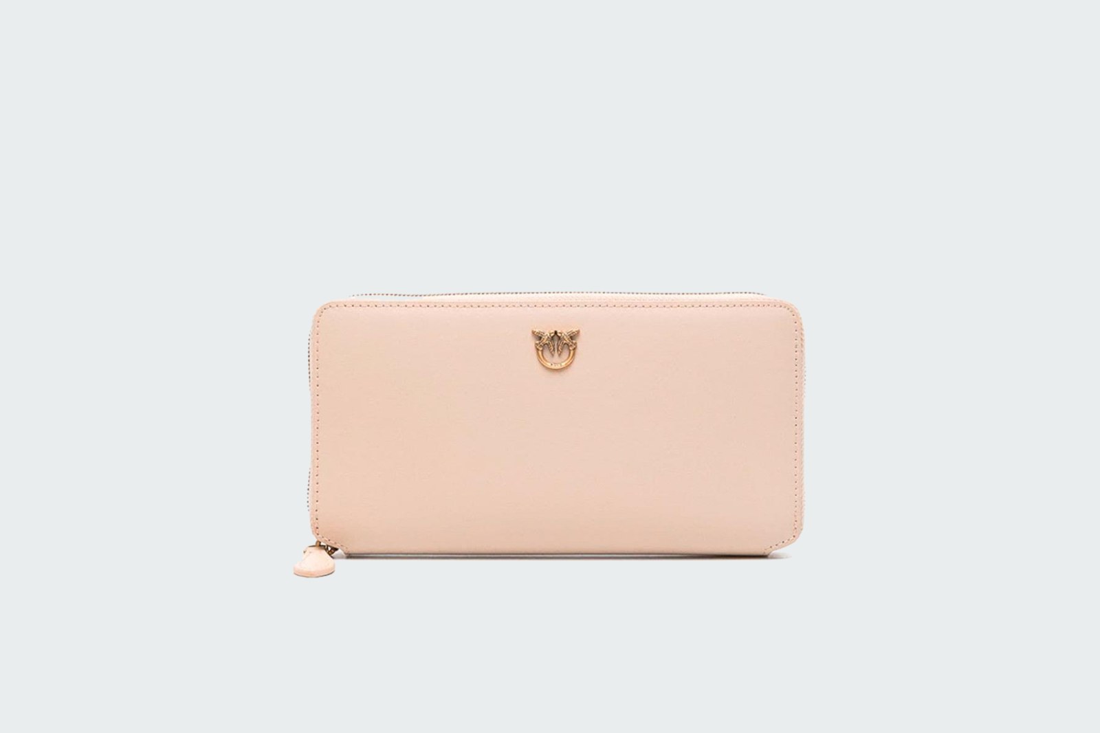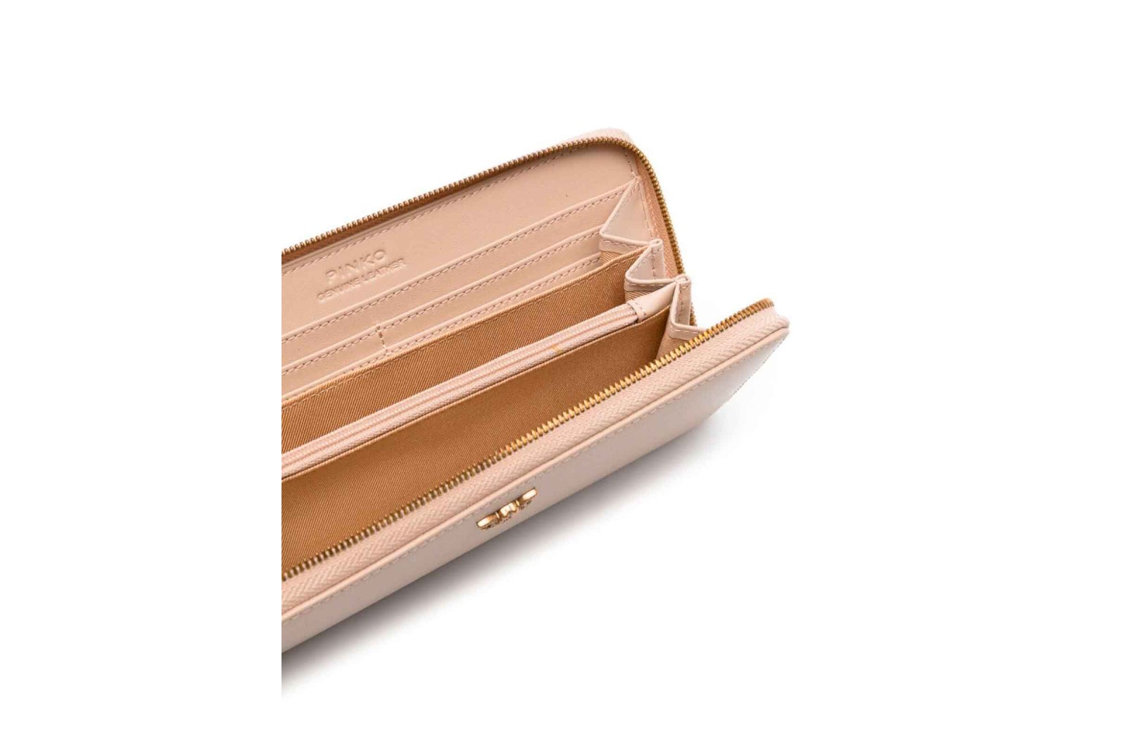 Элегантный кошелек, выполненный в бежевом цвете, украшенный рельефной стежкой «елочка». Детали из золотистого металла — фирменное лого и молния — подчеркивают роскошный вид аксессуара.