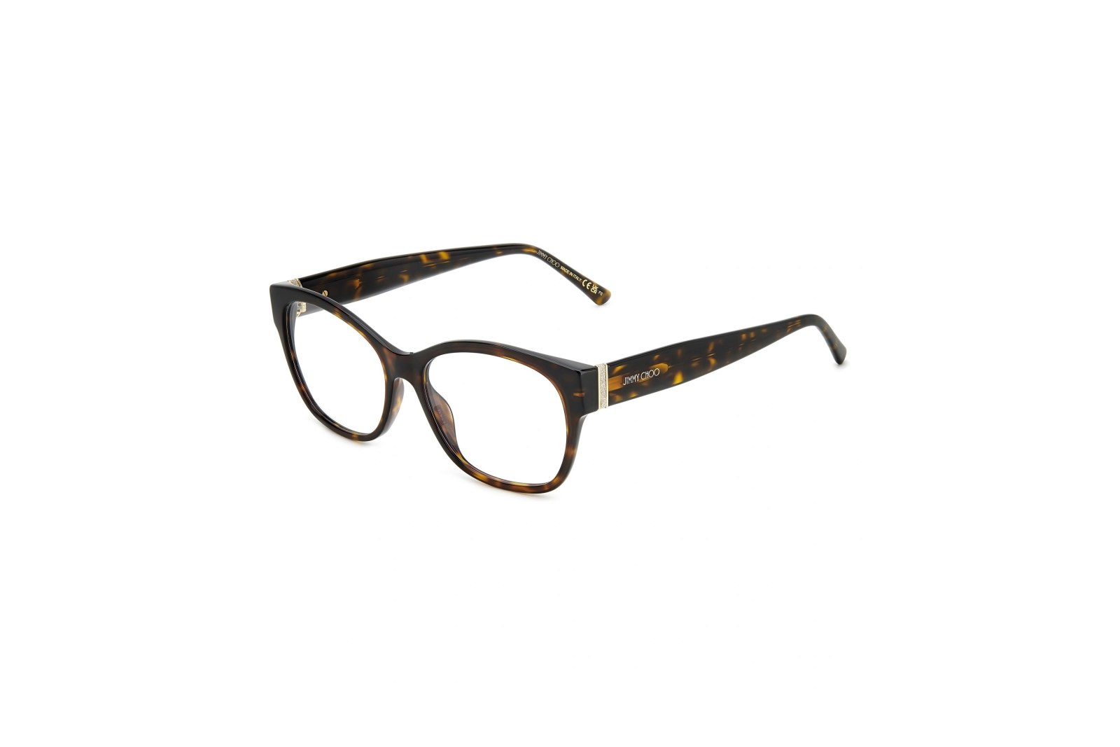 Массивная прямоугольная медицинская оправа из черепахового ацетата. Дужки украшены стразами и логотипом Jimmy Choo. В комплекте — фирменный чехол.
