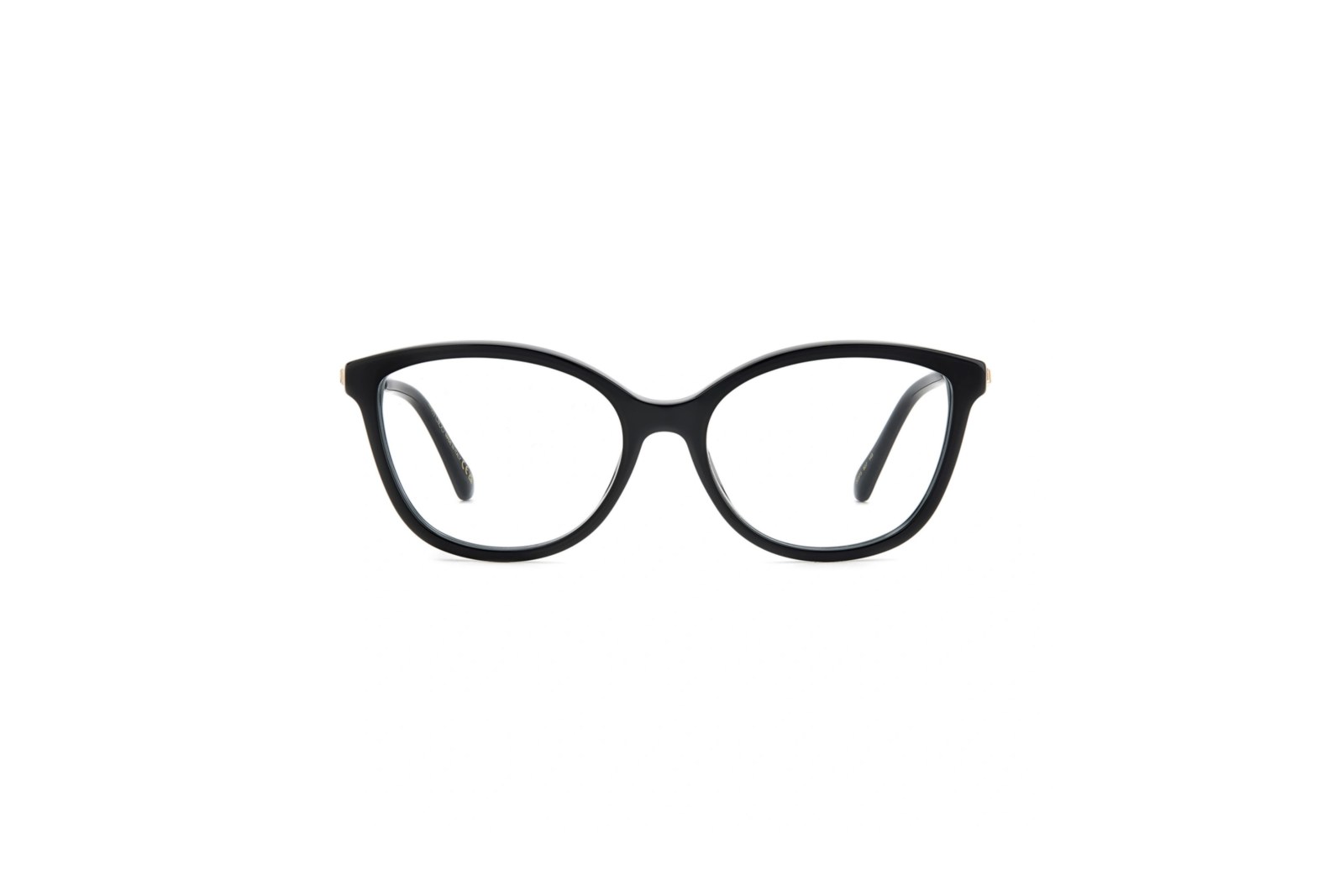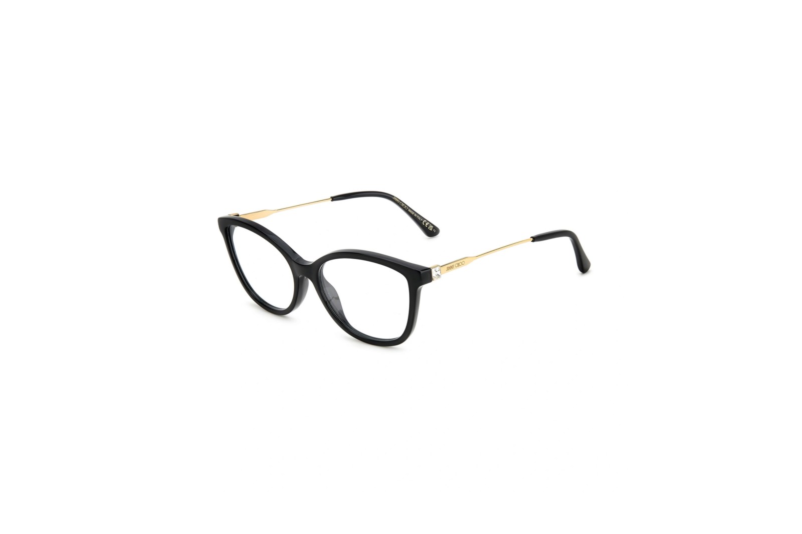 Легкая квадратная медицинская оправа из черного ацетата. Тонкие дужки из золотистого ацетата украшены стразами и логотипом Jimmy Choo. В комплекте — фирменный чехол.