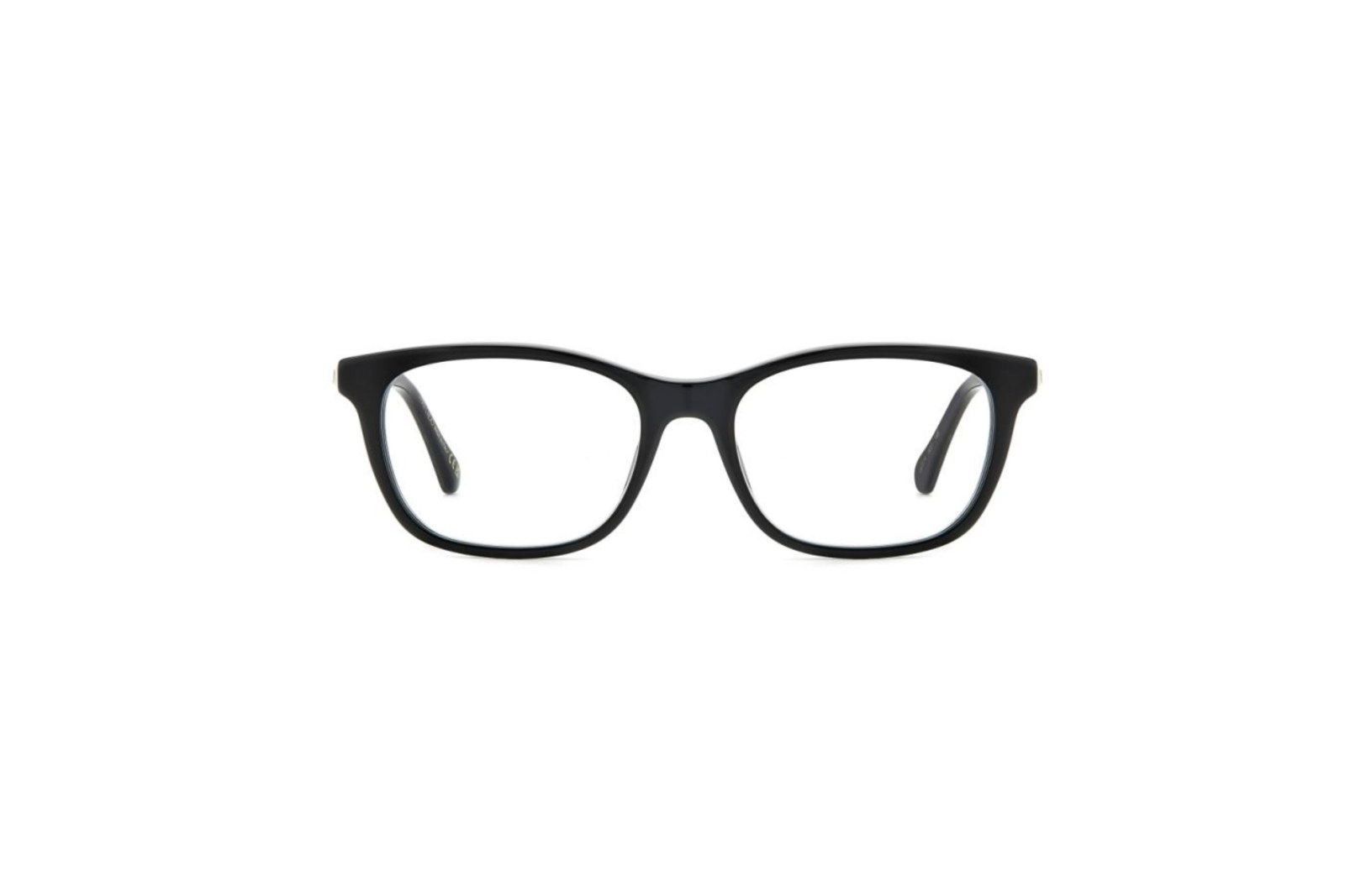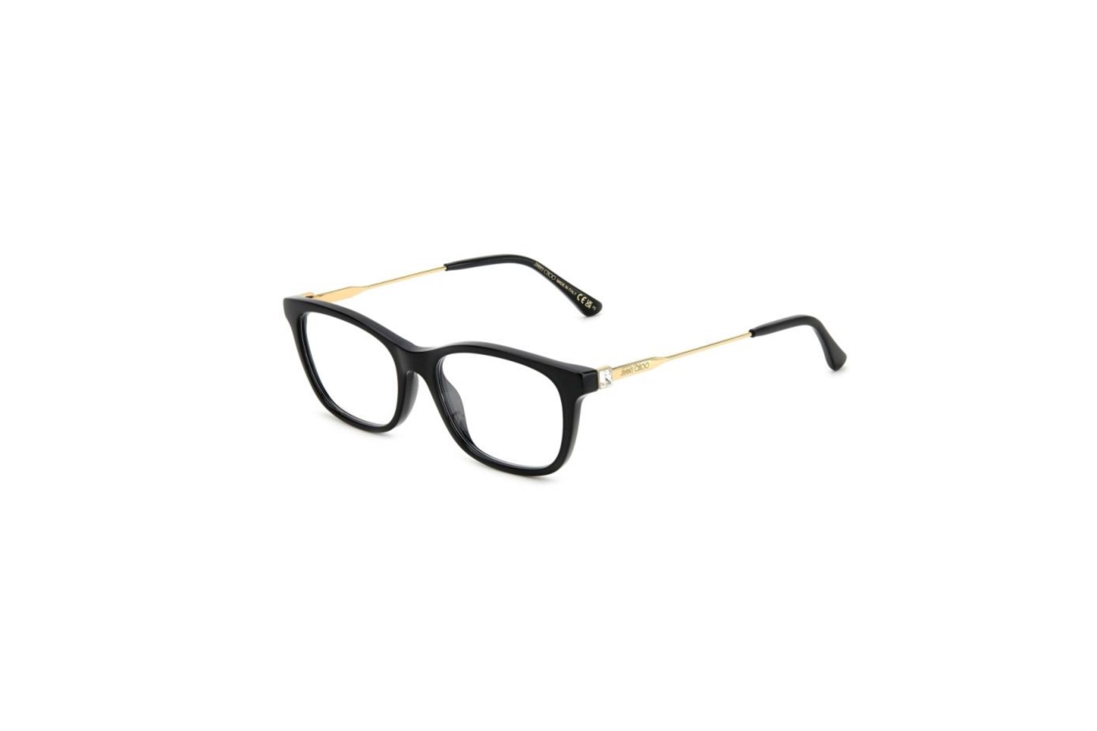 Легкая прямоугольная медицинская оправа из черного ацетата. Тонкие золотистые металлические дужки украшены стразами и логотипом Jimmy Choo. В комплекте — фирменный чехол.