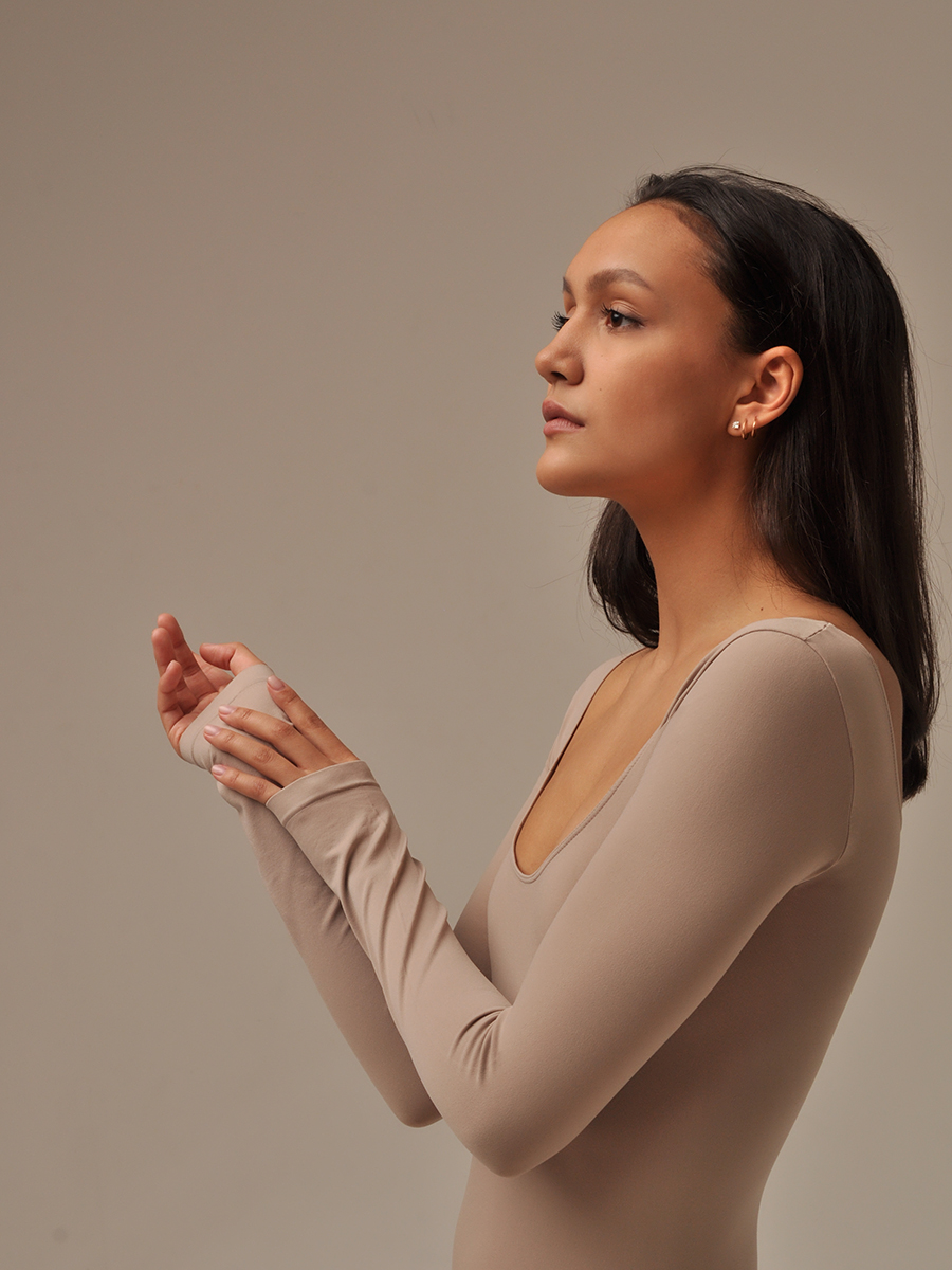 Женское боди с длинным рукавом и квадратным вырезом. Модель выполнена из мягкой эластичной микрофибры без боковых швов. Низ изделия оформлен в виде трусов-бразилиано с застёжкой – крючки. Благодаря бесшовной технологии изготовления, боди идеально облегает фигуру и ощущается как вторая кожа.