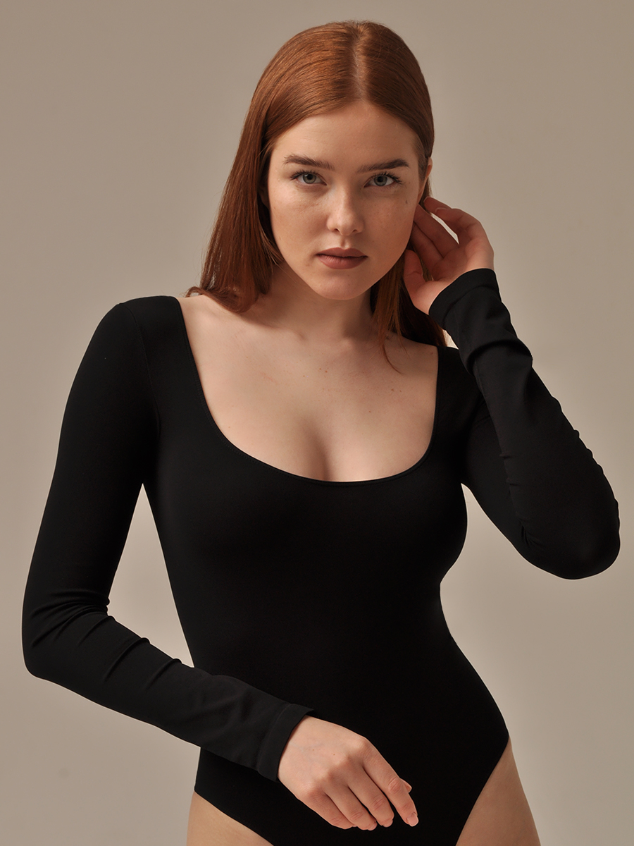 Женское боди с длинным рукавом и квадратным вырезом. Модель выполнена из мягкой эластичной микрофибры без боковых швов. Низ изделия оформлен в виде трусов-бразилиано с застёжкой – крючки. Благодаря бесшовной технологии изготовления, боди идеально облегает фигуру и ощущается как вторая кожа.