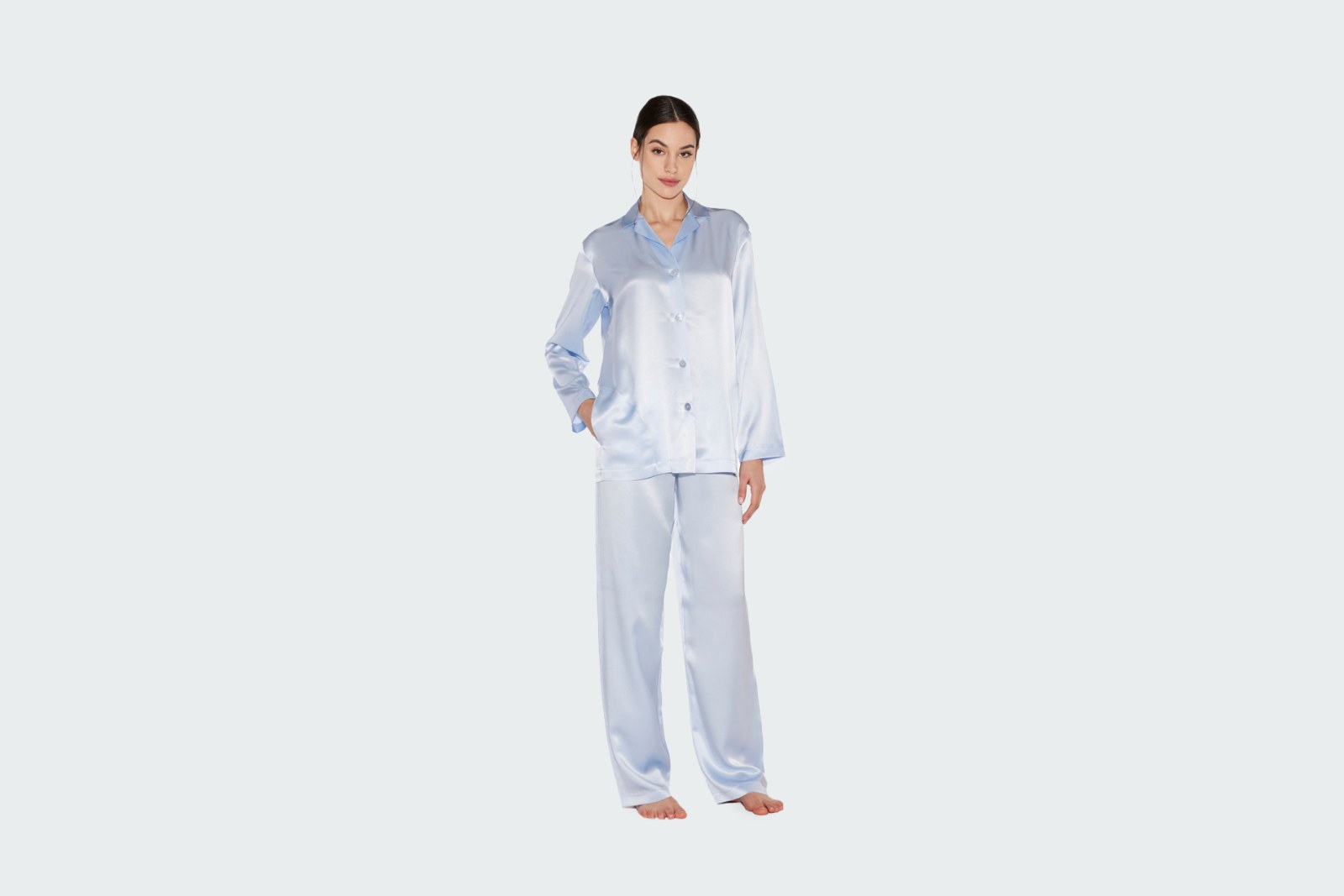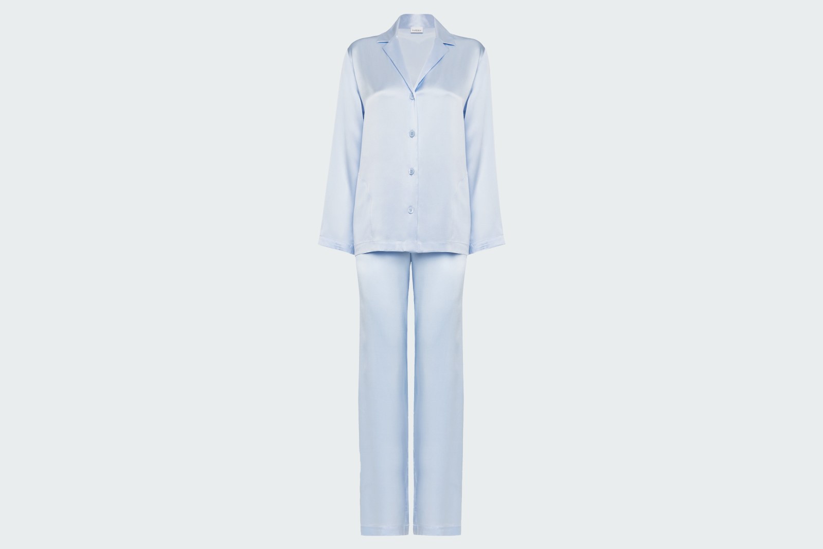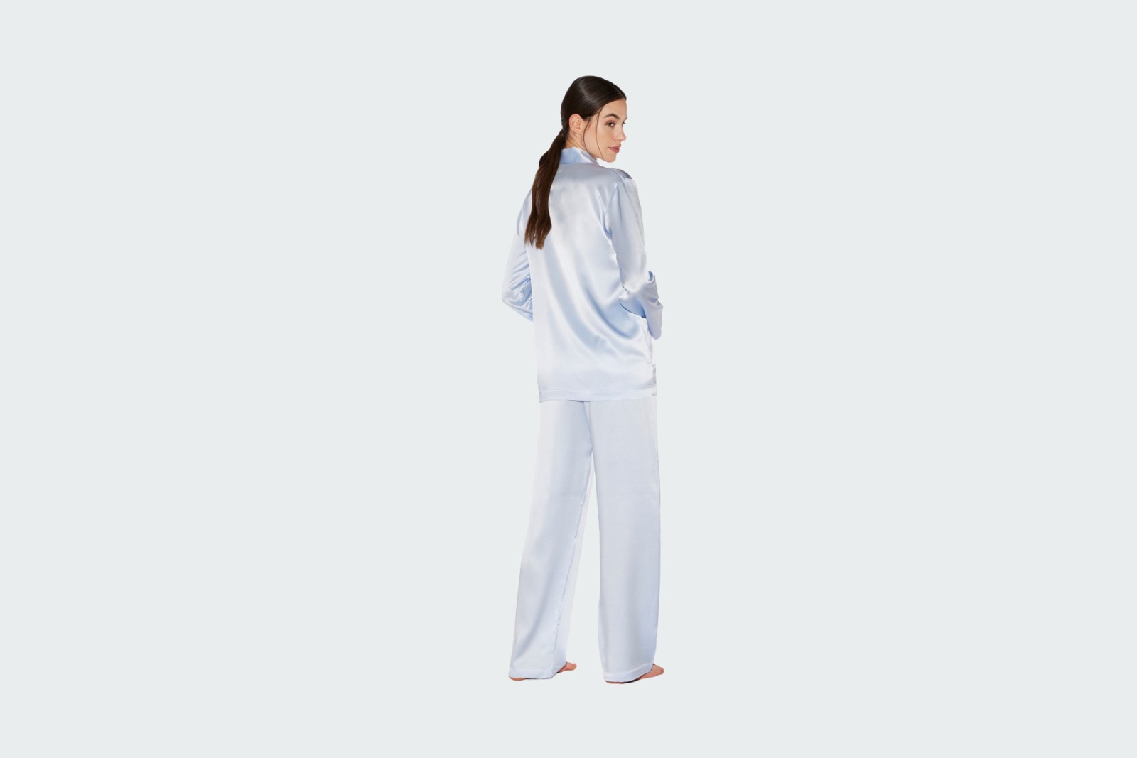 Невероятно мягкая, роскошная пижама из шелкового атласа. Пижамный комплект состоит из классической рубашки на пуговицах с длинными рукавами и брюк с кулиской на талии и свободной посадкой.