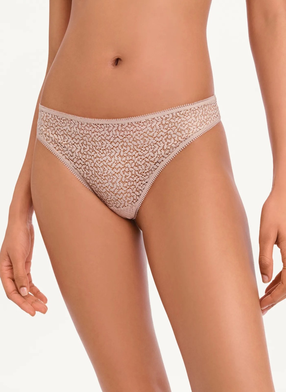 Женские трусы-стринги из тонкого ажурного кружева. Средняя посадка, отделка контуров фантазийным эластичным кантом, фирменный логотип на поясе сзади.