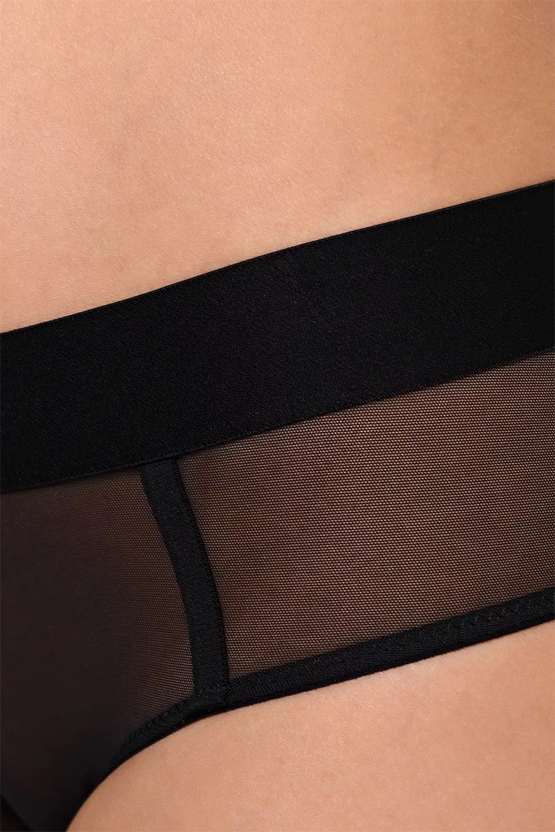 Женские трусы-хипстеры с завышенной талией. Эластичная широкая резинка, полупрозрачный тюль, хлопковая ластовица