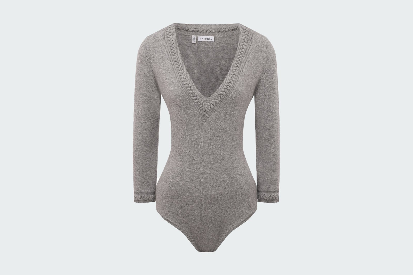 Боди выполнено из тонкой шерсти с добавлением волокон нейлона и нежного кашемира. Глубокое V-образное декольте дополнены отделкой в виде объемных плетеных кос. Боди комфортно садится на тело, не раздражает кожу и сохраняет тепло длительное время.