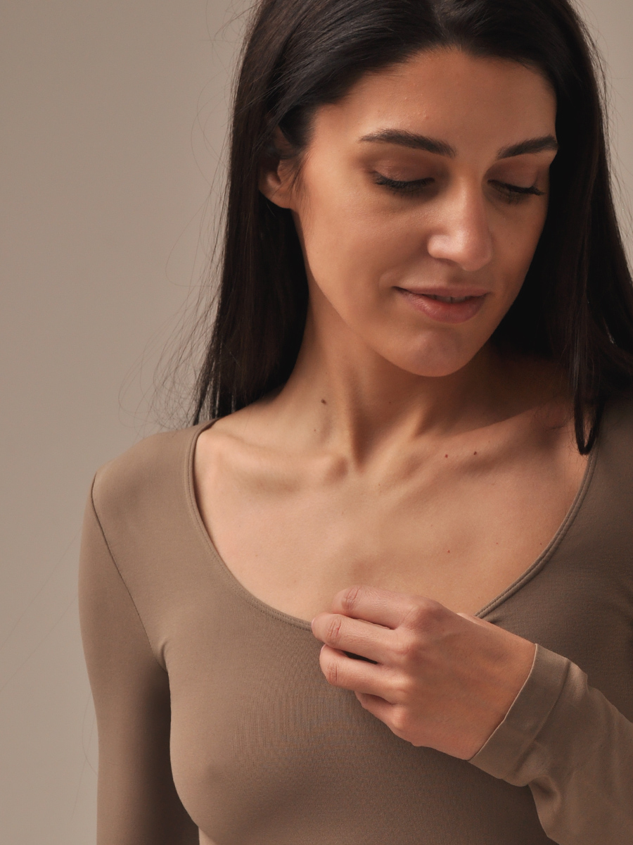 Женское боди с длинным рукавом и глубоким круглым вырезом. Модель выполнена из мягкой эластичной микрофибры без боковых швов. Низ изделия оформлен в виде классических трусов слипов с застёжкой – крючки. Благодаря бесшовной технологии изготовления, боди идеально облегает фигуру и ощущается как вторая кожа.