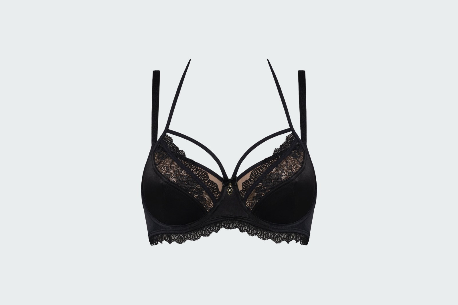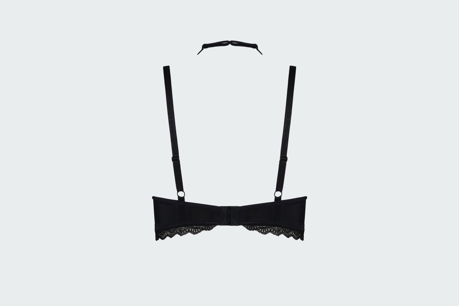 Элегантный черный бюстгальтер-балконет с кружевными вставками и дизайном халтер. Модель оснащена регулируемыми тонкими бретелями и застежкой-зажимом на спине.