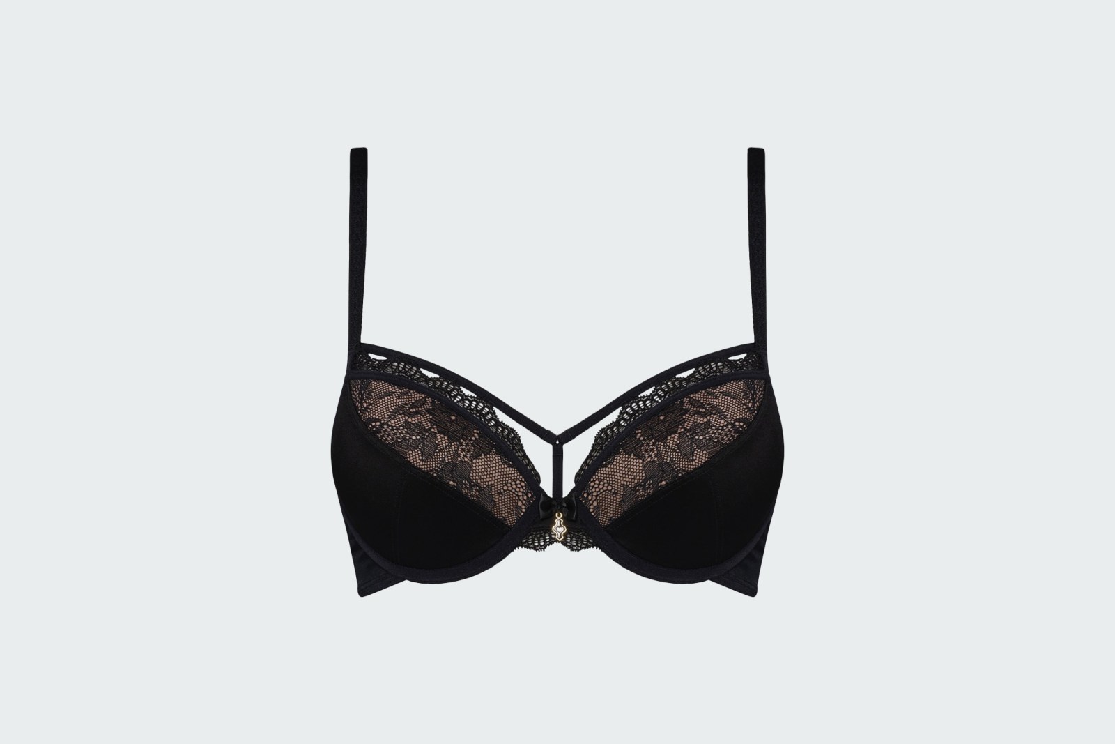 Элегантный черный бюстгальтер-балконет с кружевными вставками и дизайном халтер. Модель оснащена регулируемыми тонкими бретелями и застежкой-зажимом на спине.