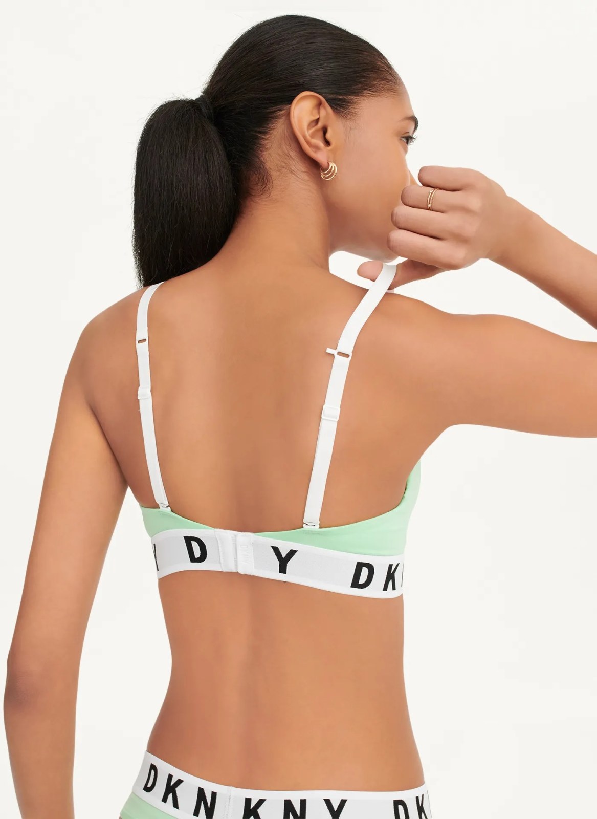 Узкие регулируемые бретели смыкаются между лопаток при помощи крючка. V-образная зона декольте, широкая эластичная резинка под грудью декорирована фирменным логотипом, застежка сзади на три крючка.