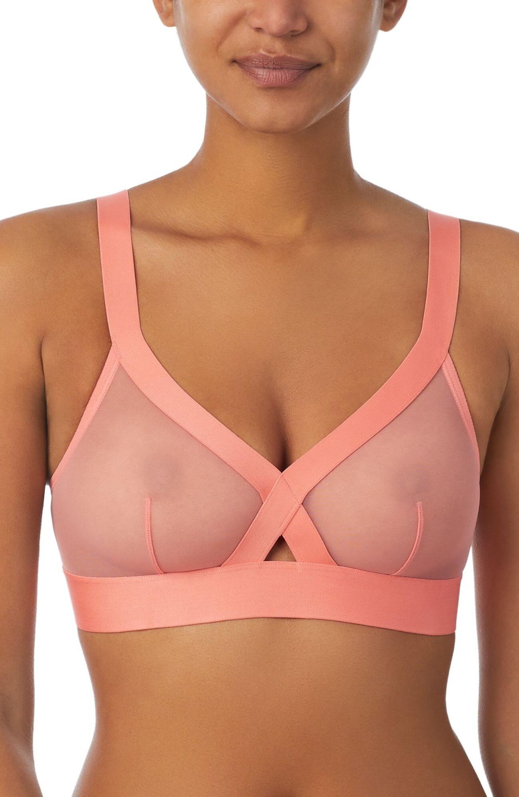 Женский бюстгальтер-бралетт c мягкой чашкой без косточек и резинкой под грудью. Регулируемые бретели, полупрозрачный тюль, застежка на 3 крючка.