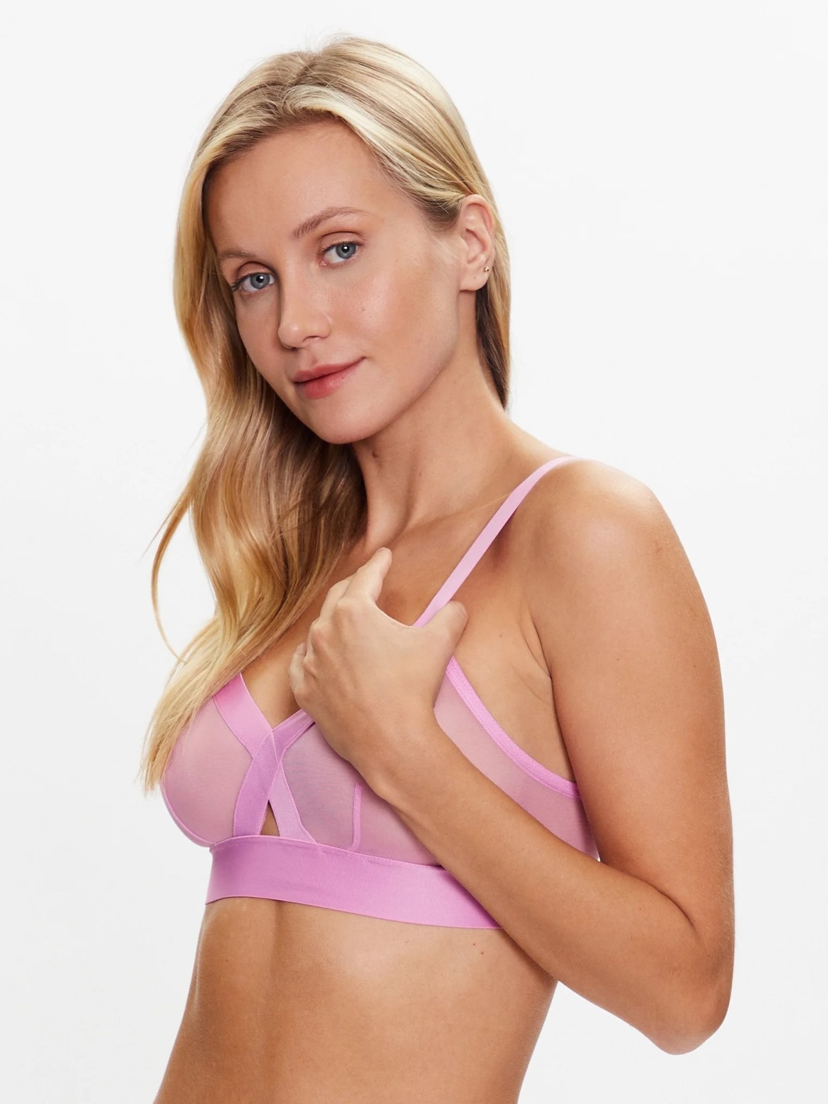 Женский бюстгальтер-бралетт c мягкой чашкой без косточек и резинкой под грудью. Регулируемые бретели, полупрозрачный тюль, застежка на 3 крючка в 3 позиции.