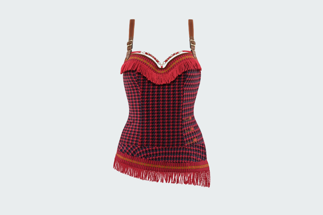 Корсет из кутюрной коллекции с проволочной подкладкой создает ослепительную фигуру в виде песочных часов. Классический принт Pied de poule напечатан современным и экологичным цифровым способом. Авангардные детали, такие как цепочки с вплетенными лентами, игривая бахрома и напечатанные булавки добавляют последние штрихи.