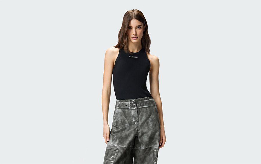 Майка из хлопкового джерси с добавлением эластана для эластичности. Модель с удлинённым спортивным вырезом и вышитым логотипом PINKO на передней части. Ребристая фактура делает этот базовый топ универсальным элементом гардероба, идеальным для создания функциональных и женственных повседневных образов весной.