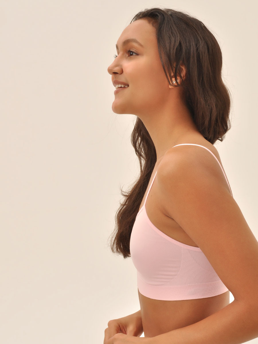 Базовый топ на тонких бретелях. Модель выполнена по бесшовной технологии из мягкой эластичной микрофибры, без чашки и уплотнения. Широкая резинка по нижнему краю обеспечивает мягкую комфортную поддержку груди. Тонкие эластичные бретели не регулируются по длине