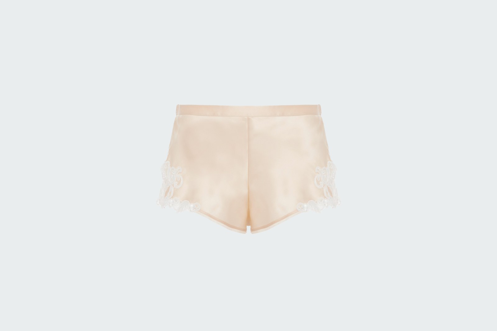 Пижамные шорты изготовлены из невесомого шелкового атласа. Края боковых разрезов декорировали ажурным цветочным кружевом, выполненным вручную в старинной технике frastaglio.