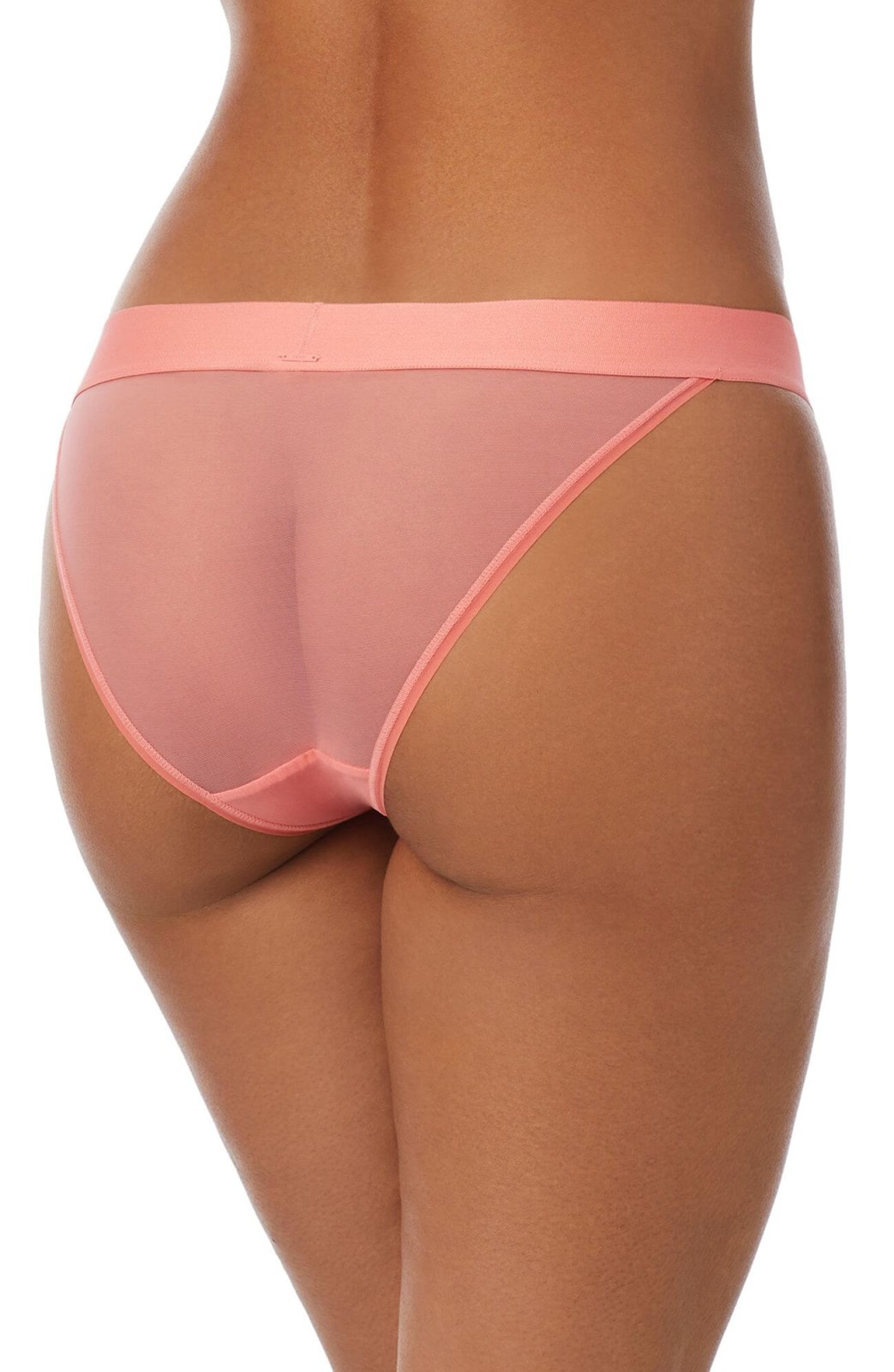 Женские трусы-слипы средней посадки с широким поясом. Выполнены из сетчатой тюли с хлопковой ластовицей.