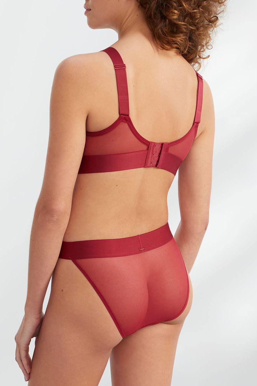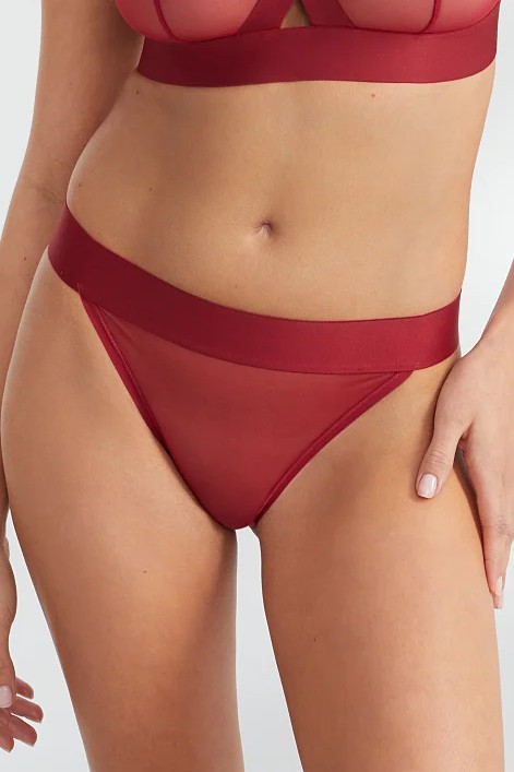 Женские трусы-слипы средней посадки с широким поясом. Выполнены из сетчатой тюли с хлопковой ластовицей.
