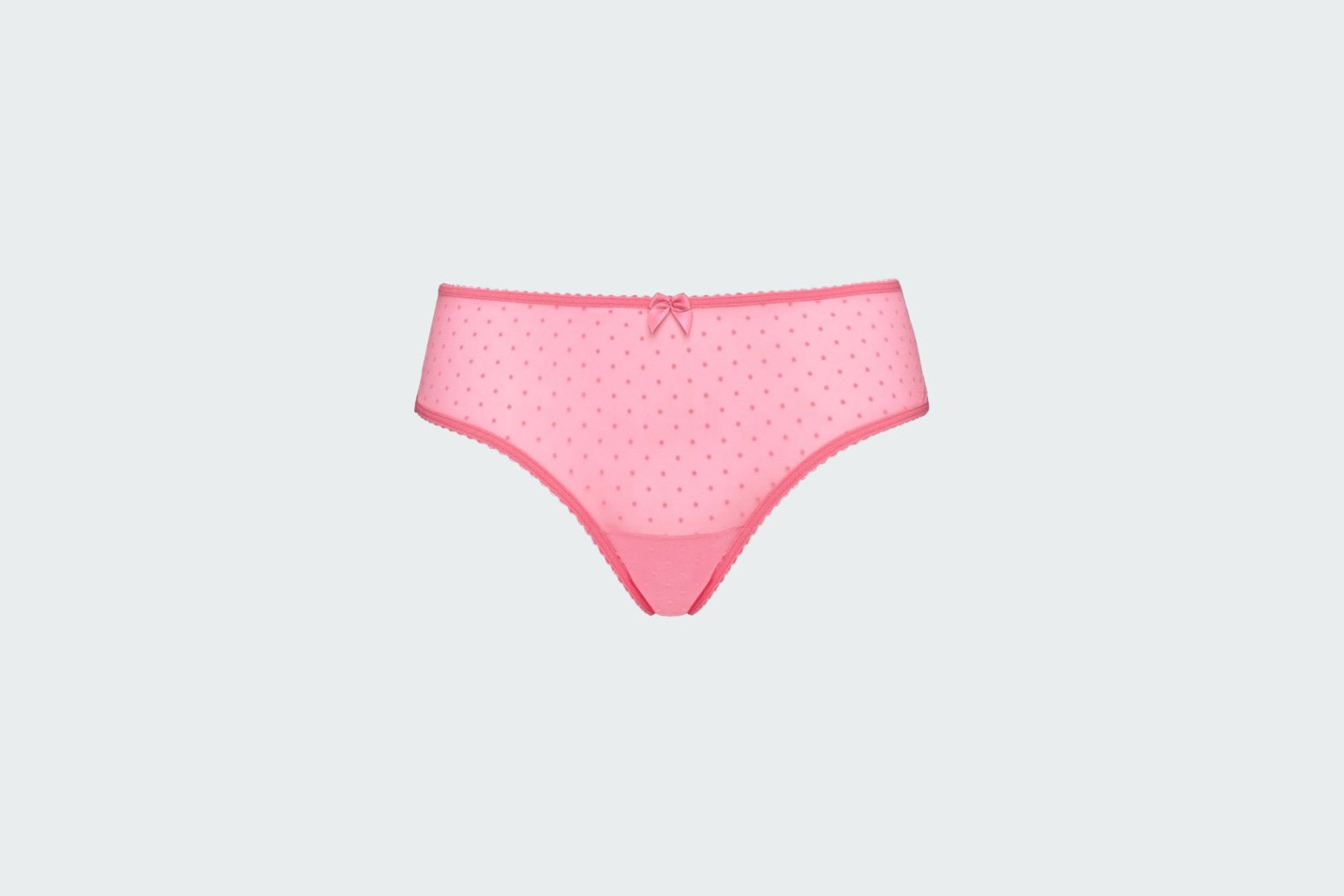 Трусы-бразилиана изготовлены из розовой сетчатой ткани с мелким горошком. Кокетливая отделка, милые атласные банты и вырезы добавляют игривости и мечтательности дизайну. Комфортная посадка частично закрывает бедра, оставляя открытыми живот и нижнюю часть ягодиц.