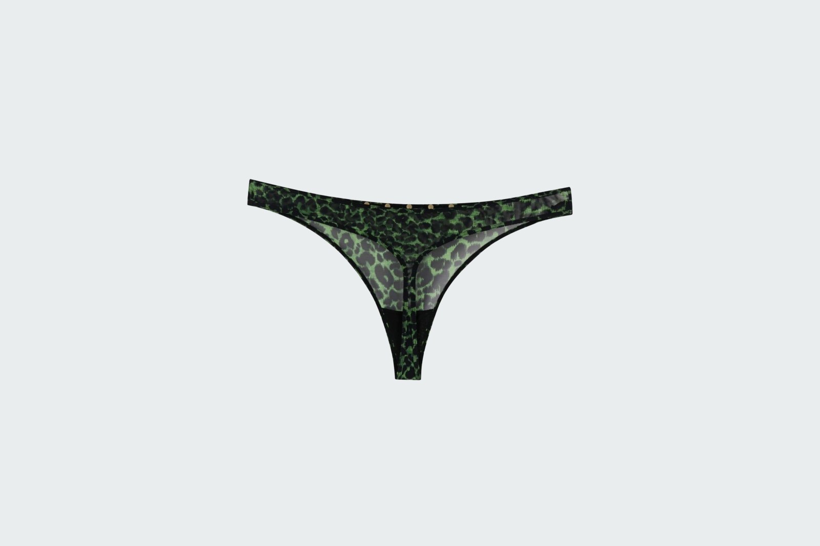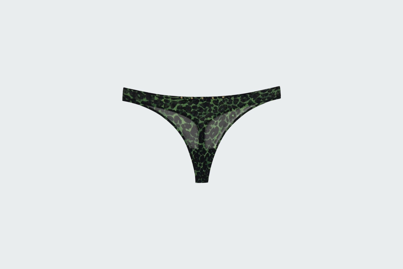 Модный леопардовый принт создан с помощью цифровой печати: самый экологичный способ окрашивания ткани. Стринги с изящной отделкой имеют боковые стороны размером 4 сантиметра и оставляют ягодицы открытыми. Золотые круглые шпильки спереди являются кропотливой дизайнерской работой.