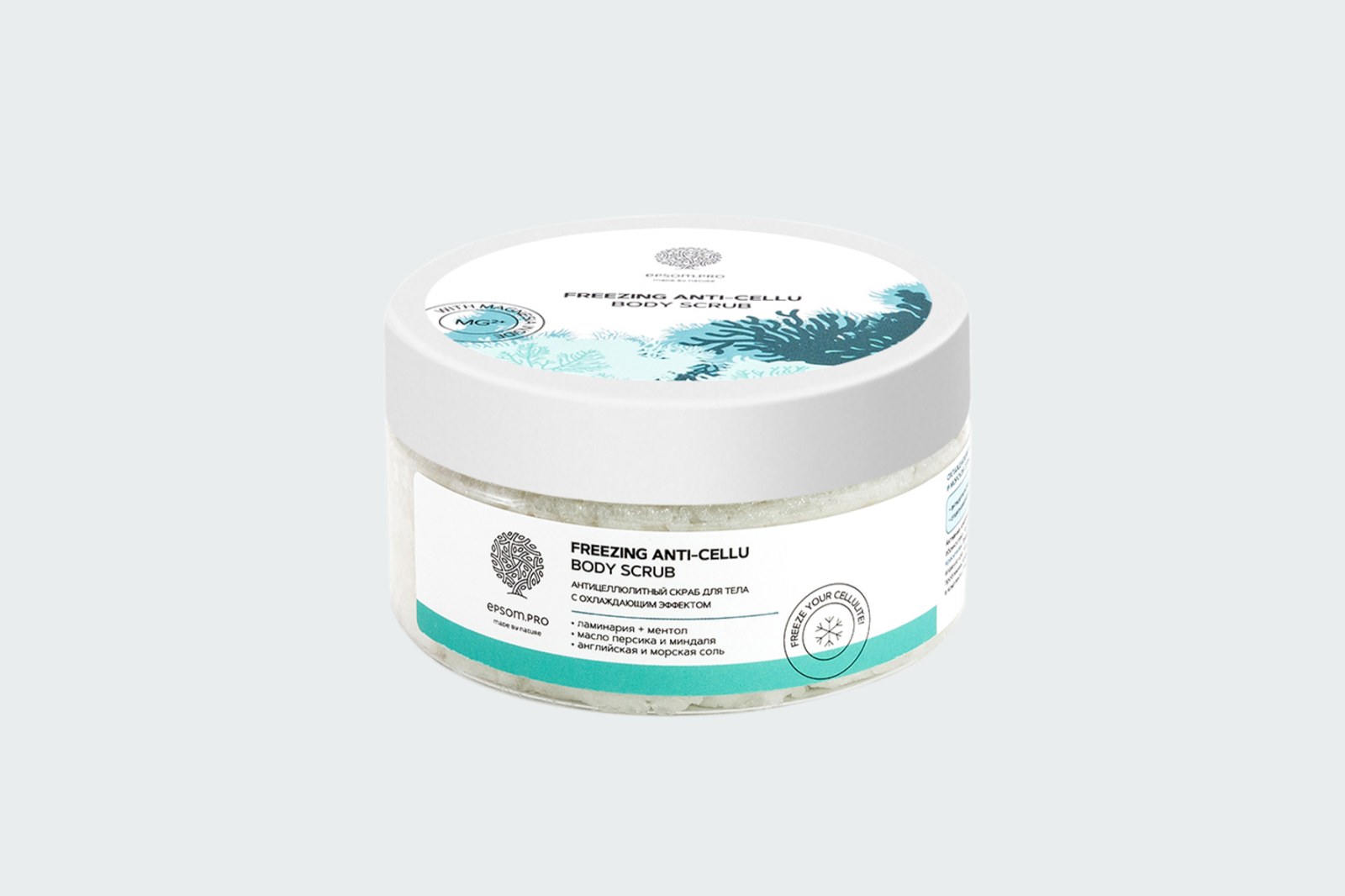 Скраб бьет сразу по трем мишеням: холод уменьшает объемы, английская соль убирает отечность, а ламинария работает над качеством кожи.
