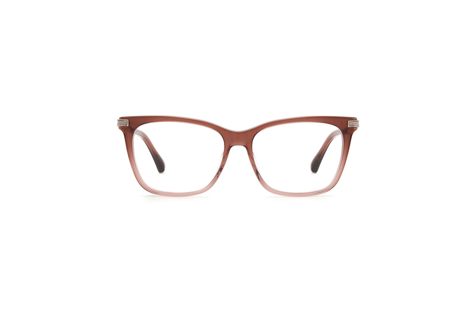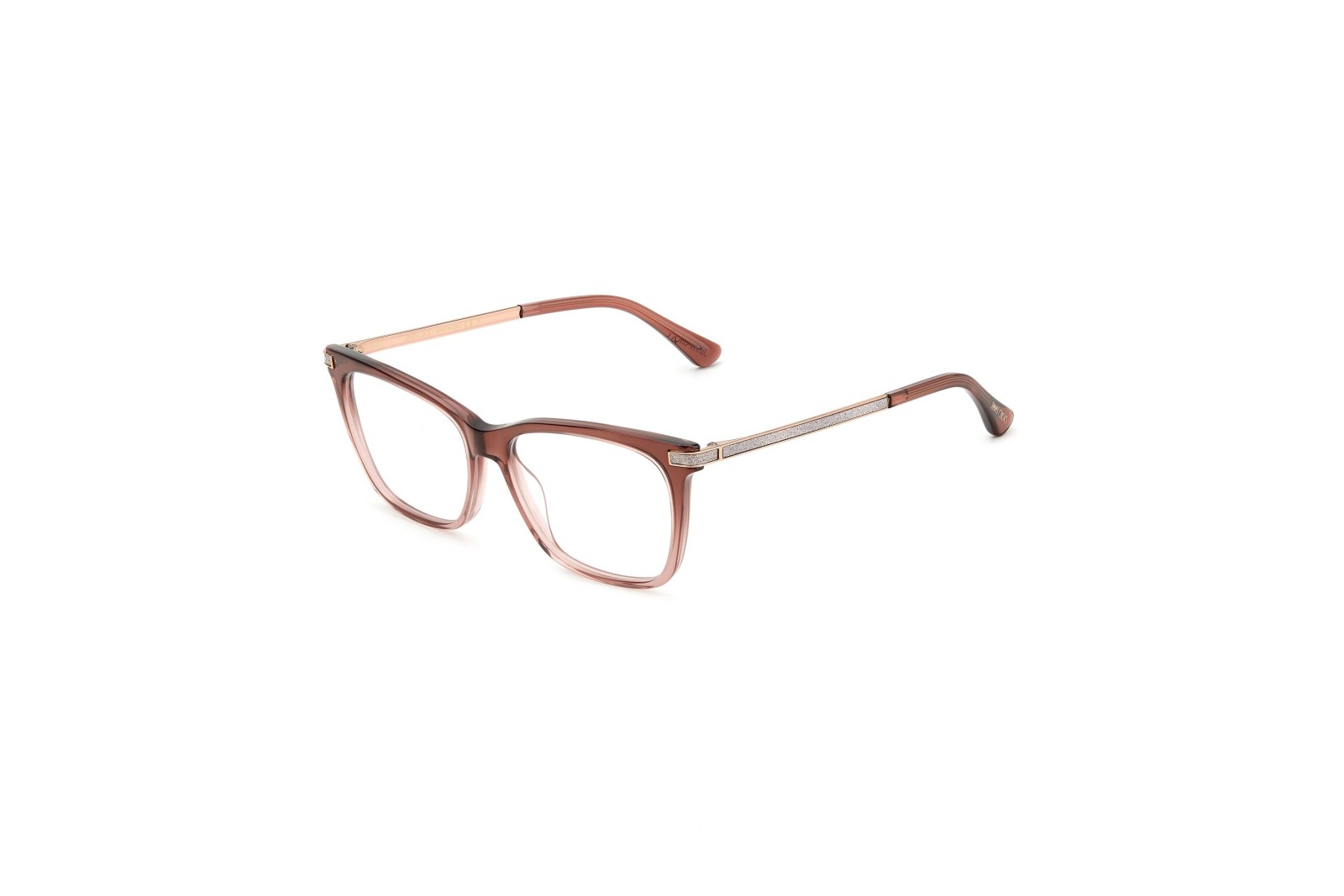 Легкая прямоугольная медицинская оправа из коричневого ацетата. Тонкие золотистые дужки украшены стразами и логотипом Jimmy Choo. В комплекте — фирменный чехол.