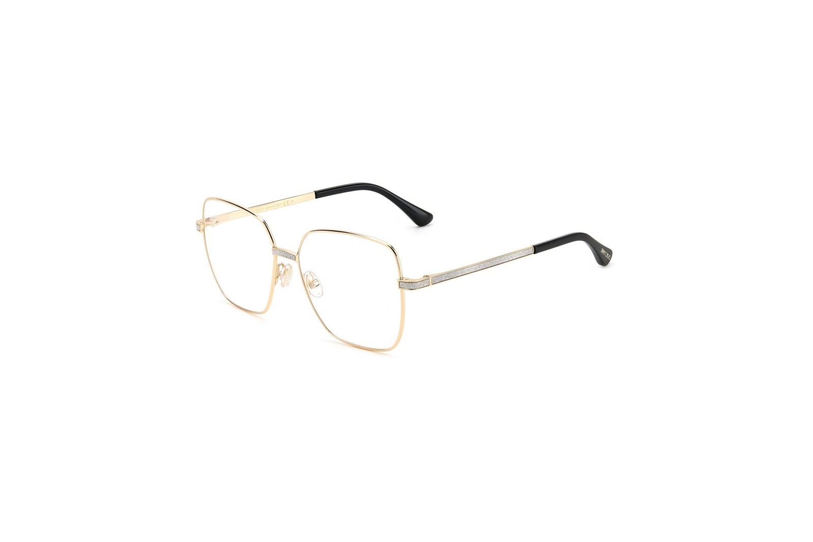 Легкая квадратная медицинская оправа из золотистого металла. Тонкие дужки украшены стразами и логотипом Jimmy Choo. В комплекте — фирменный чехол.
