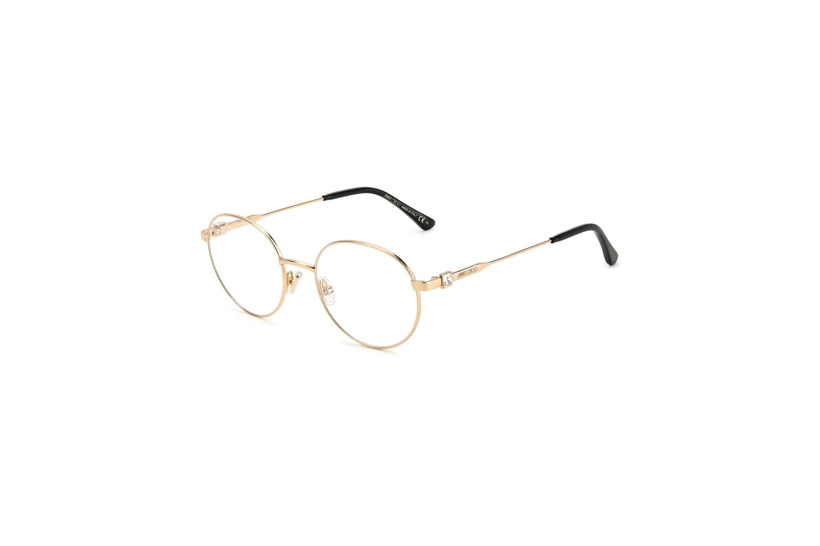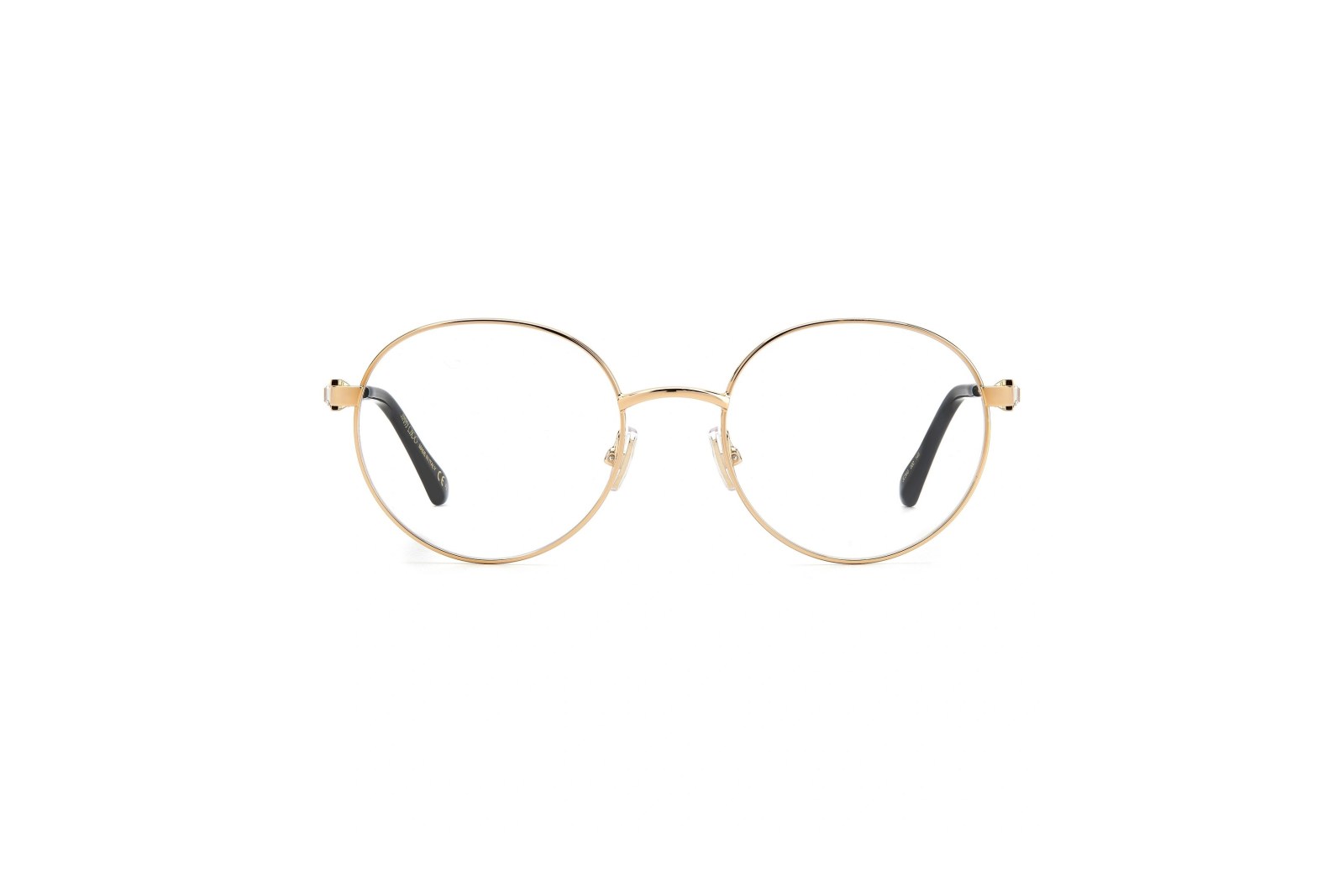 Легкая круглая медицинская оправа из золотистого металла. Тонкие дужки украшены стразами и логотипом Jimmy Choo. В комплекте — фирменный чехол.