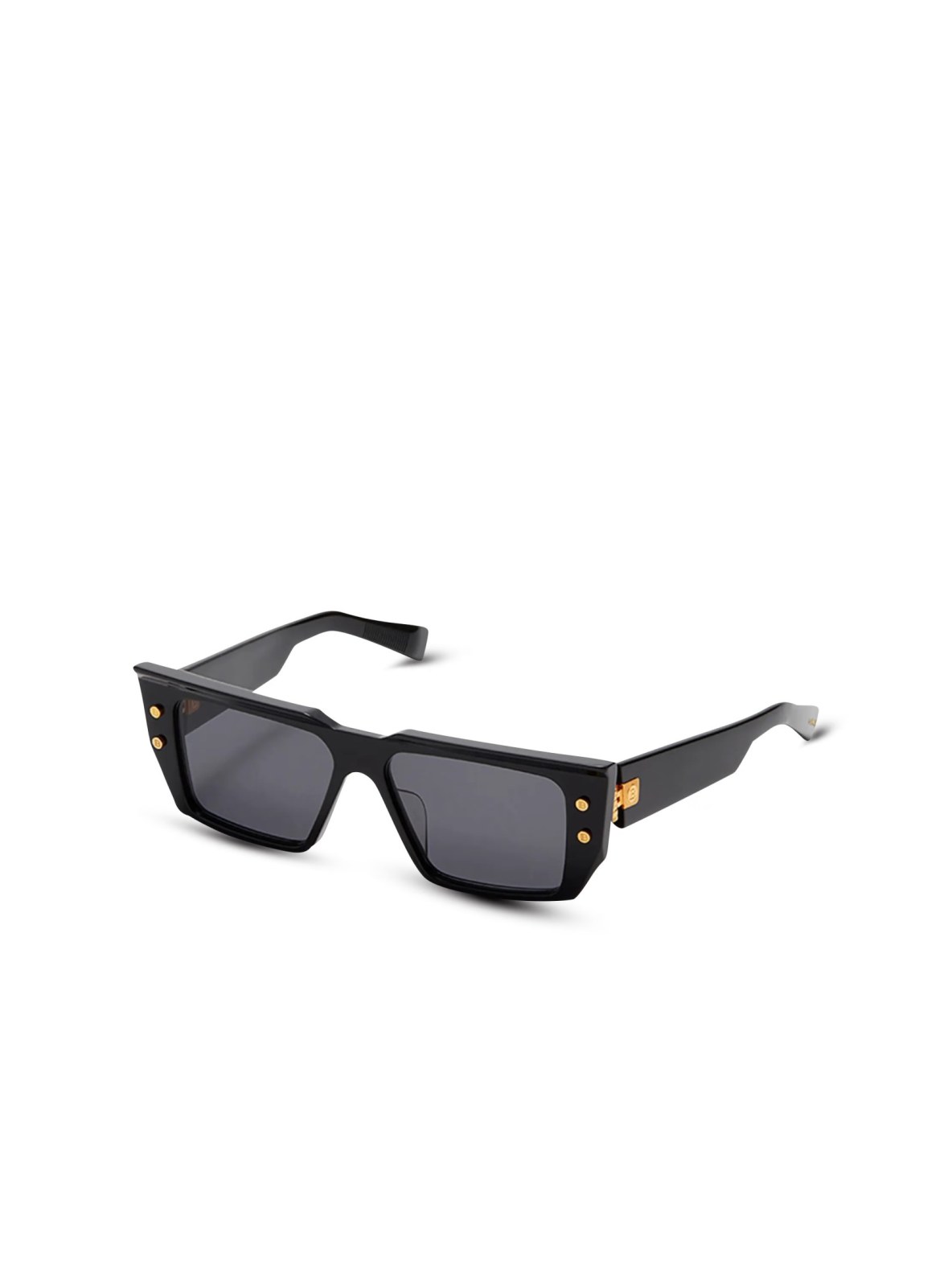 Большие прямоугольные солнцезащитные очки в массивной титановой оправе. Тонкие дужки с роскошным логотипом Balmain сбоку. В комплекте – чехол из натуральной кожи.