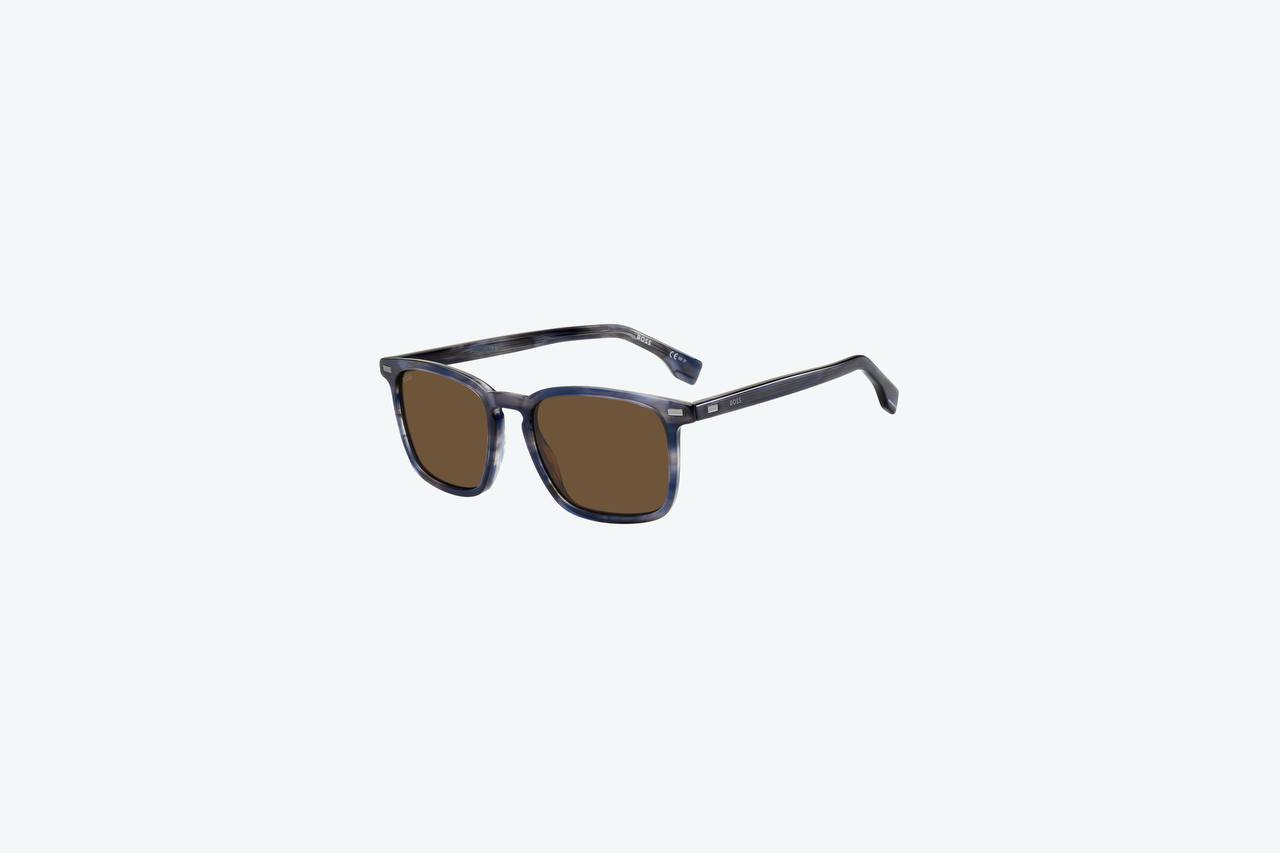 Мужские солнцезащитные очки от BOSS выполнены из ацетата в цвете «Blue Havana». Линзы выполнены в цвете «Brown».
