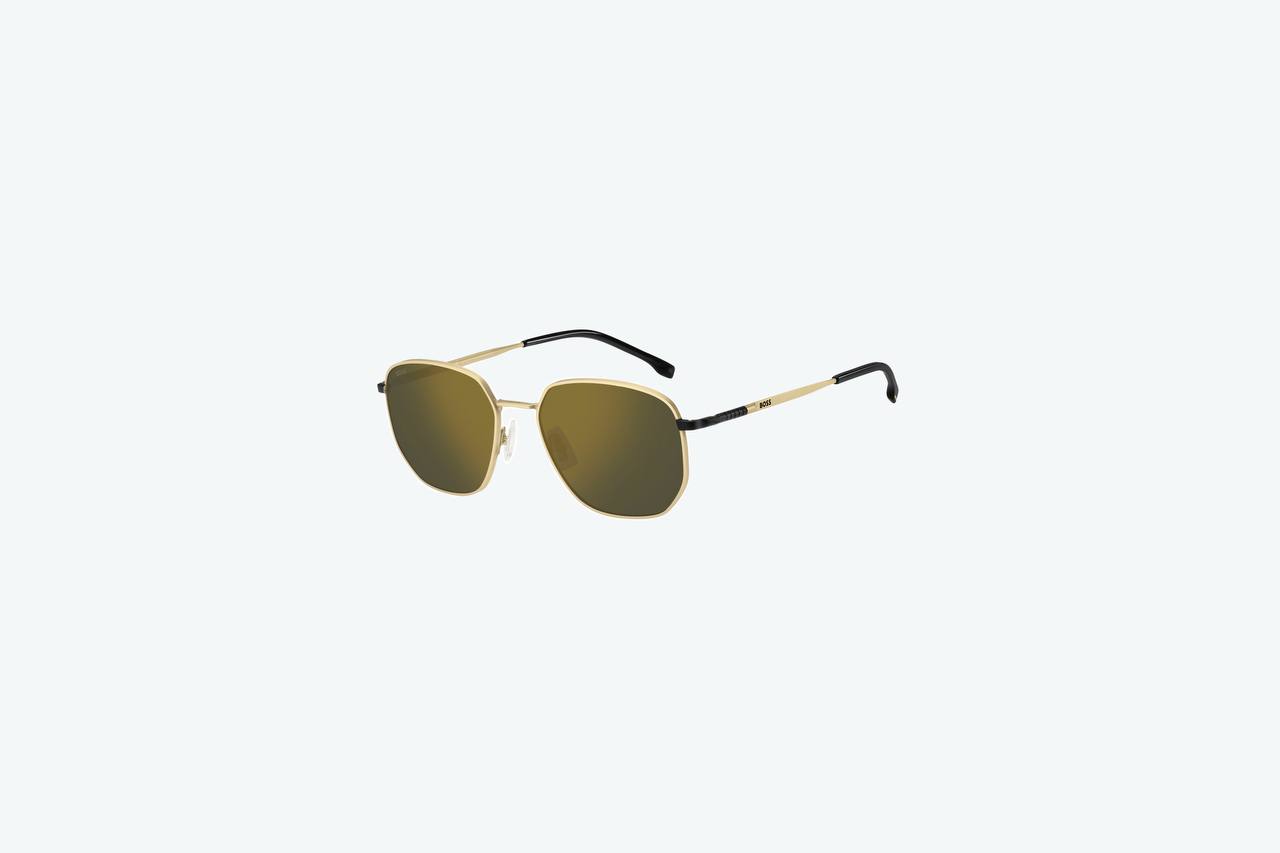 Мужские солнцезащитные очки от BOSS выполнены из металла в цвете «Matte Gold Black». Линзы выполнены из поликарбоната в цвете «Grey Bronze Mirror».