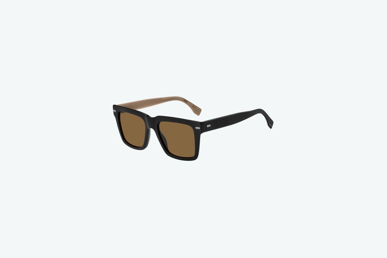 Мужские солнцезащитные очки от BOSS выполнены из ацетата в чёрном цвете. Линзы выполнены в коричневом цвете.