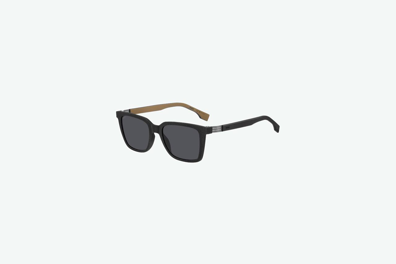 Мужские солнцезащитные очки от BOSS выполнены из пластика в чёрном цвете. Линзы выполнены в чёрном цвете.