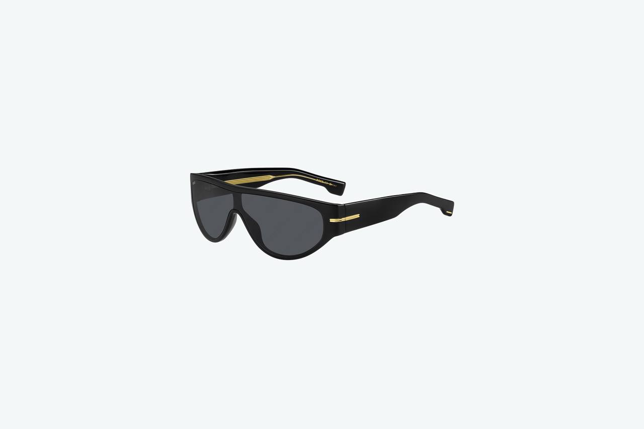 Мужские солнцезащитные очки от BOSS выполнены из ацетата в чёрном цвете. Линзы выполнены в сером цвете.