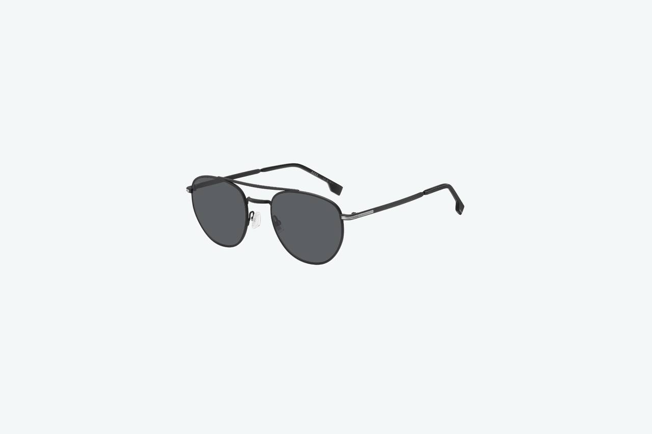 Мужские солнцезащитные очки от BOSS выполнены из металла в чёрном цвете. Линзы выполнены в сером цвете.