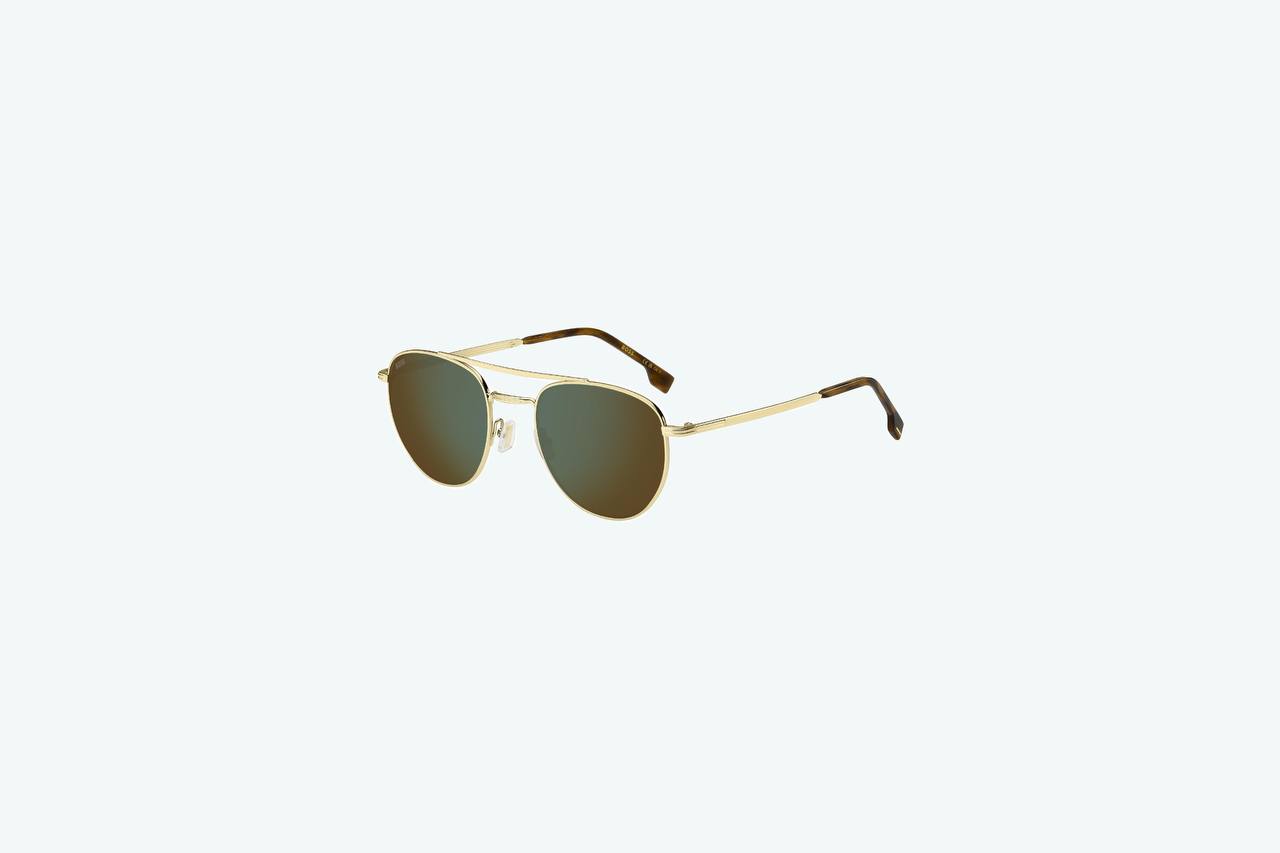 Мужские солнцезащитные очки от BOSS выполнены из металла в золотом цвете. Линзы выполнены в зелёном цвете.